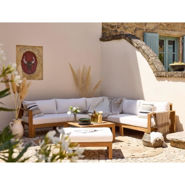 Le salon de jardin d'angle modulable LEVATA XL en bois d'acacia est idéal pour 7 personnes. Il inclut un ottoman et une housse pour une protection optimale. Sa finition en blanc cassé lui confere une élégance intemporelle, parfaite pour embellir votre extérieur.