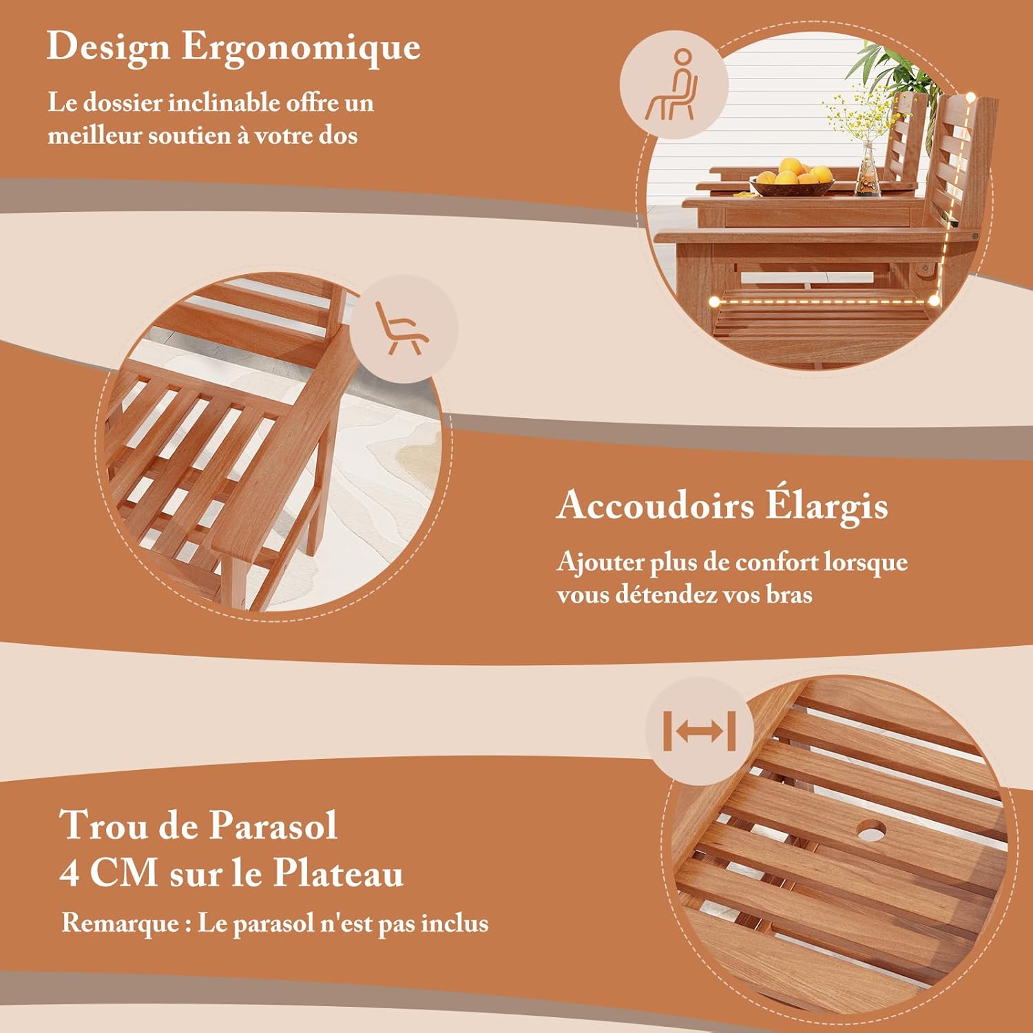 Salon de jardin en bois, fauteuil/chaise de jardin exterieur et table intégré avec trou de parasol, ensem