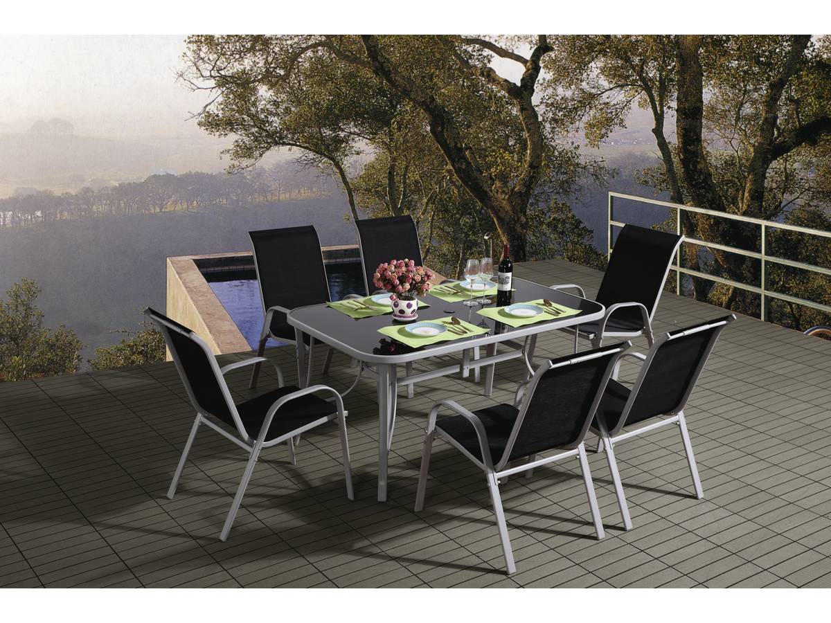 Salon de jardin en textilène "Cordoba"Le salon de jardin "Cordoba" se veut moderne, fonctionnel mais surtout convivial.L'idée est de vous proposer un produit avec lequel vous aurez envie de profiter confortablement de votre jardin. Par ailleurs, parce que l'aspect esthétique de l'importance, nous avons voulu vous présenter un salon repas au design étudié et moderne qui répond aux nouvelles tendances du mobilier de jardin.En fonction de vos goûts, celui-ci s'adaptera facilement et avec harmonie à votre jardin.Salon de jardin en textilène "Cordoba" - 1 table + 6 fauteuils - 150 x 90 x 72 cm - Couleur : Noir .Caractéristique couleur: Salon repas de jardin, structure en acier et assise en textilène - Idéal pour recevoir vos proches et vos amis autour d'un repas.