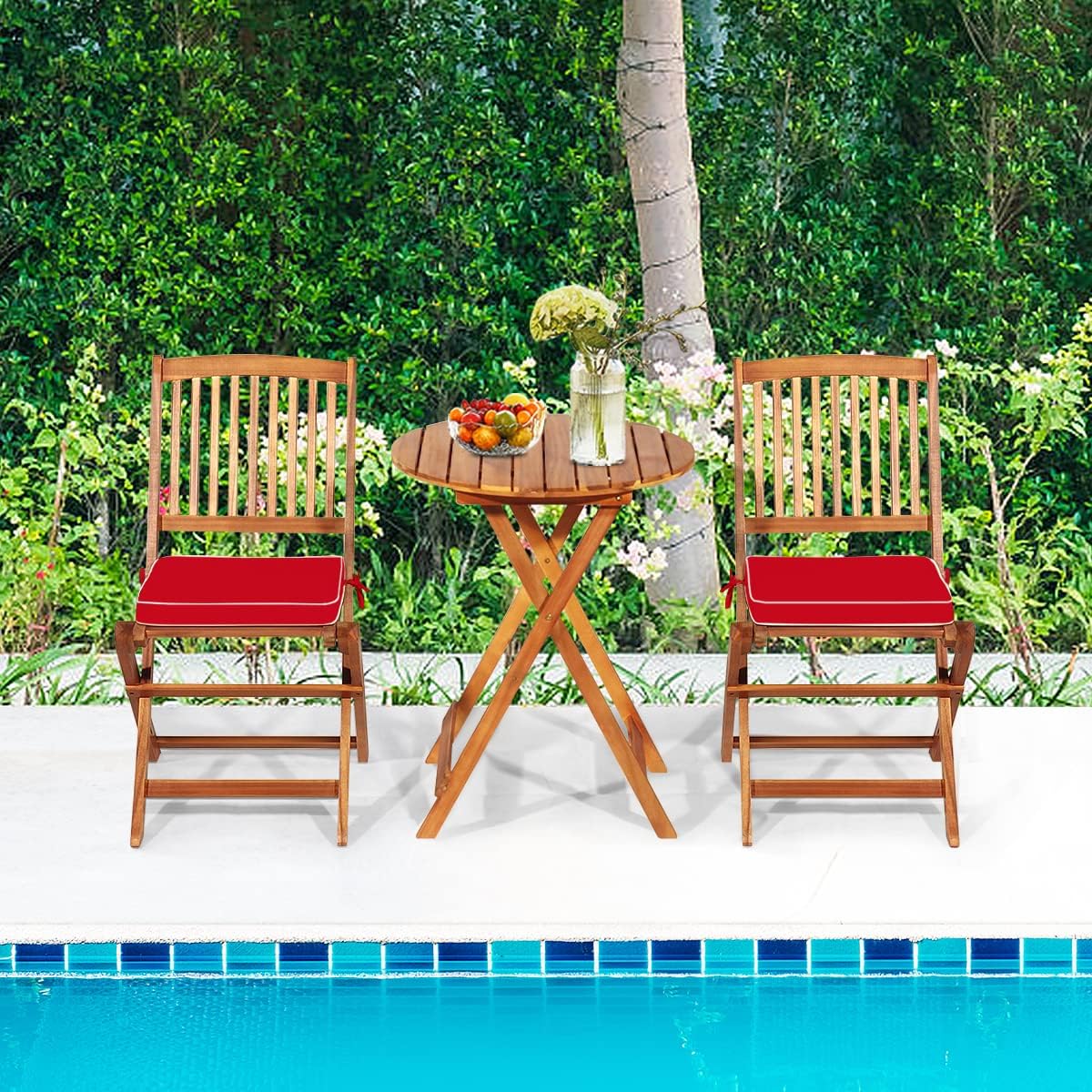 Salon de jardin exterieur 2 personnes, table bistrot en bois acacia 2 chaises 2 coussins amovibles, rouge