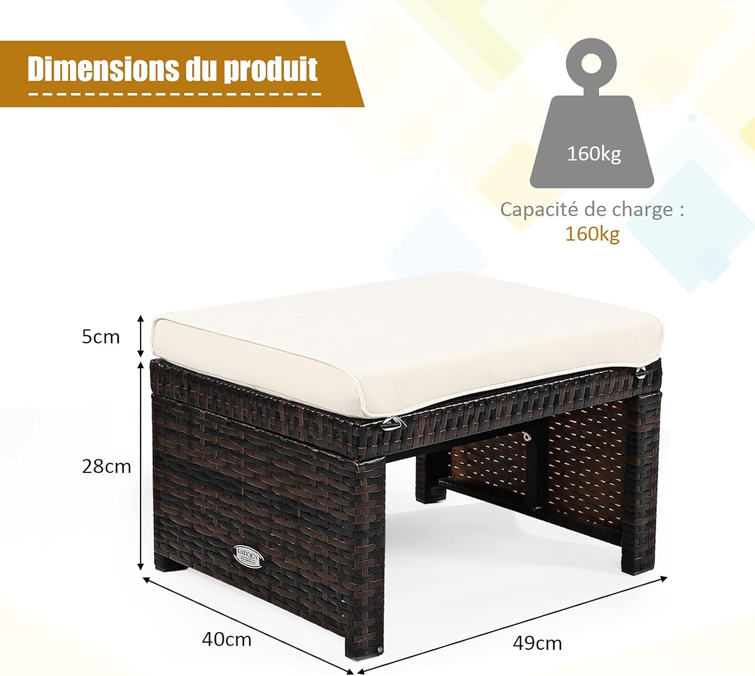 Cet ensemble de salon de jardin avec 1 table et 4 chaises (dont 2 repose-pieds), au design soigné et moderne, sera un supplément discret et pratique dans votre jardin, sur votre terrasse ou patio. Elle est robustesse et durabilité et peut résister à la déchirure et à l'usure. Les coussins épais amélioreront votre confort d'assise. Offrez-vous une pause, peu importe assis ou posant vos pieds sur ce tabouret en rotin confortable. Il comprend un plateau en verre trempé pour ranger vos affaires. Procurez-vous cet ensemble salon de jardin en rotin et commencez à profiter d'une meilleure vie en plein air!