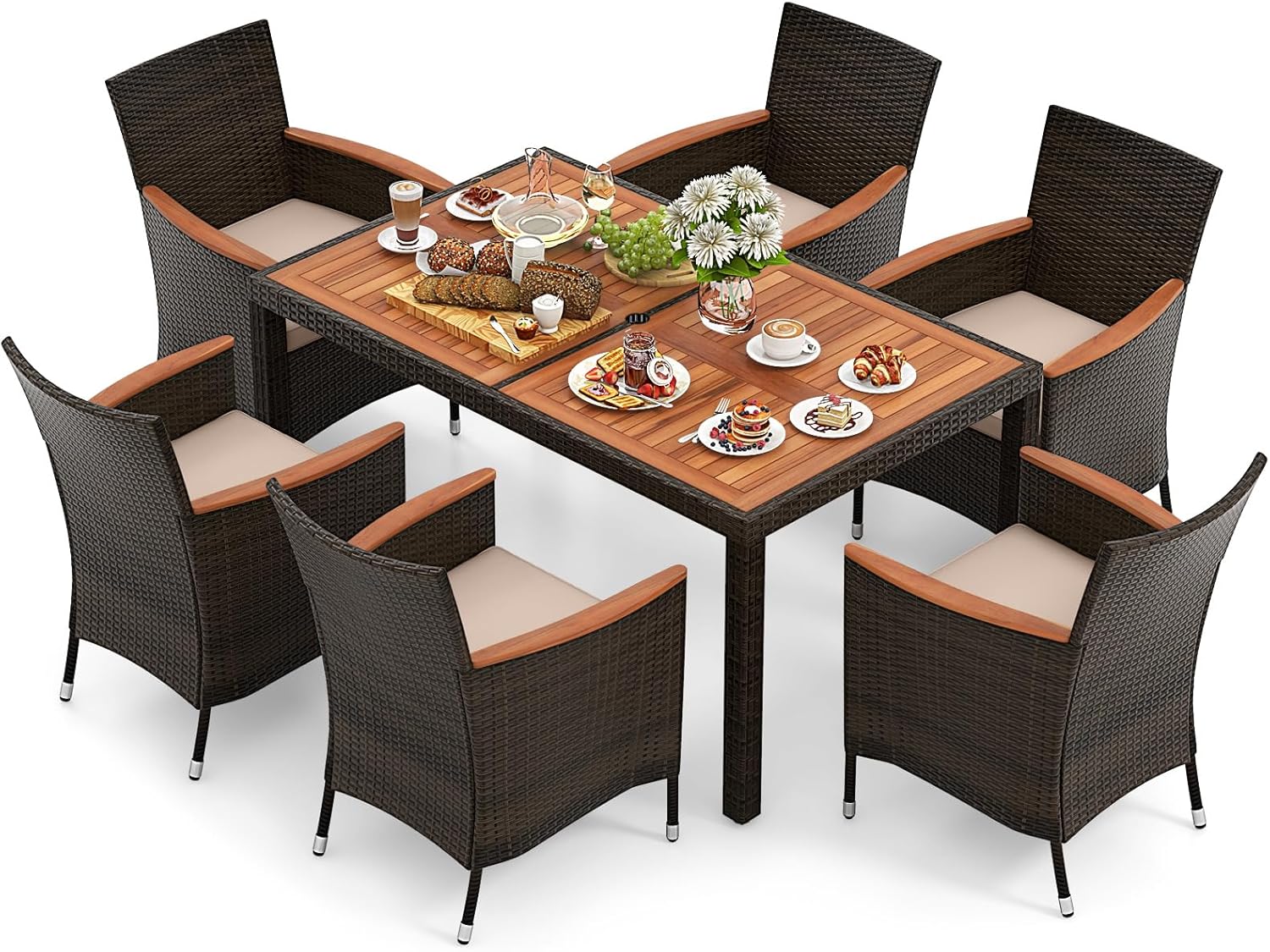 Salon de jardin extérieur en rotin, 6 fauteuils avec coussinet, table en bois d'acacia, trou de parasol
