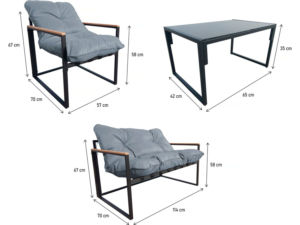 Salon de jardin "Jules" - 4 places - Gris/NoirApportez une touche de sophistication à votre extérieur avec l'ensemble de salon de jardin "Jules". Son design moderne et épuré en métal noir s'intègre parfaitement à tous les styles de jardin, terrasse ou balcon, créant un espace de détente chic et élégant. Le canapé spacieux, 114 x 70 x 67 cm et les chaises confortables de 70 x 57 x 67 cm vous invitent à passer des moments inoubliables en famille ou entre amis. La table basse, pratique et stylée, est idéale pour poser vos boissons ou petits accessoires tout en ajoutant une touche raffinée à l'ensemble. Cet ensemble de 4 places combine confort, durabilité et design, offrant un cadre parfait pour profiter du plein air. Offrez-vous un mobilier extérieur qui transforme votre espace en un véritable lieu de relaxation et de convivialité, où chaque moment devient spécial. Ne laissez pas passer l'occasion d'embellir votre extérieur avec le salon de jardin "Jules" !Ensemble de salon de jardin "Jules" - 4 places - Dimension du canapé : 114 x 70 x 67 cm - Dimension chaise : 70 x 57 x 67 cm - Dimension de la table : 65 x 42 x 35 cm - Epaisseur du verre : 4.5 mm - Hauteur d'assise : 35.5 cm - Métal - Gris/Noir .Descriptif: Ensemble de salon de jardin Jules - 4 places - Dimension du canapé : 114 x 70 x 67 cm - Dimension chaise : 70 x 57 x 67 cm - Dimension de la table : 65 x 42 x 35 cm - Epaisseur du verre : 4.5 mm - Hauteur d'assise : 35.5 cm - Métal - Gris/Noir