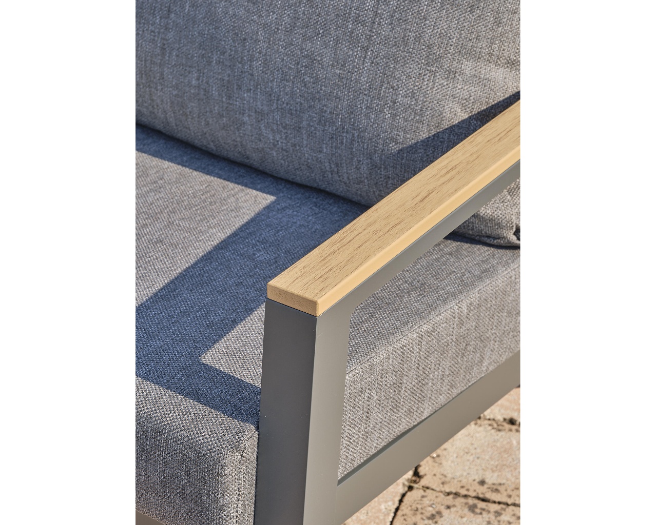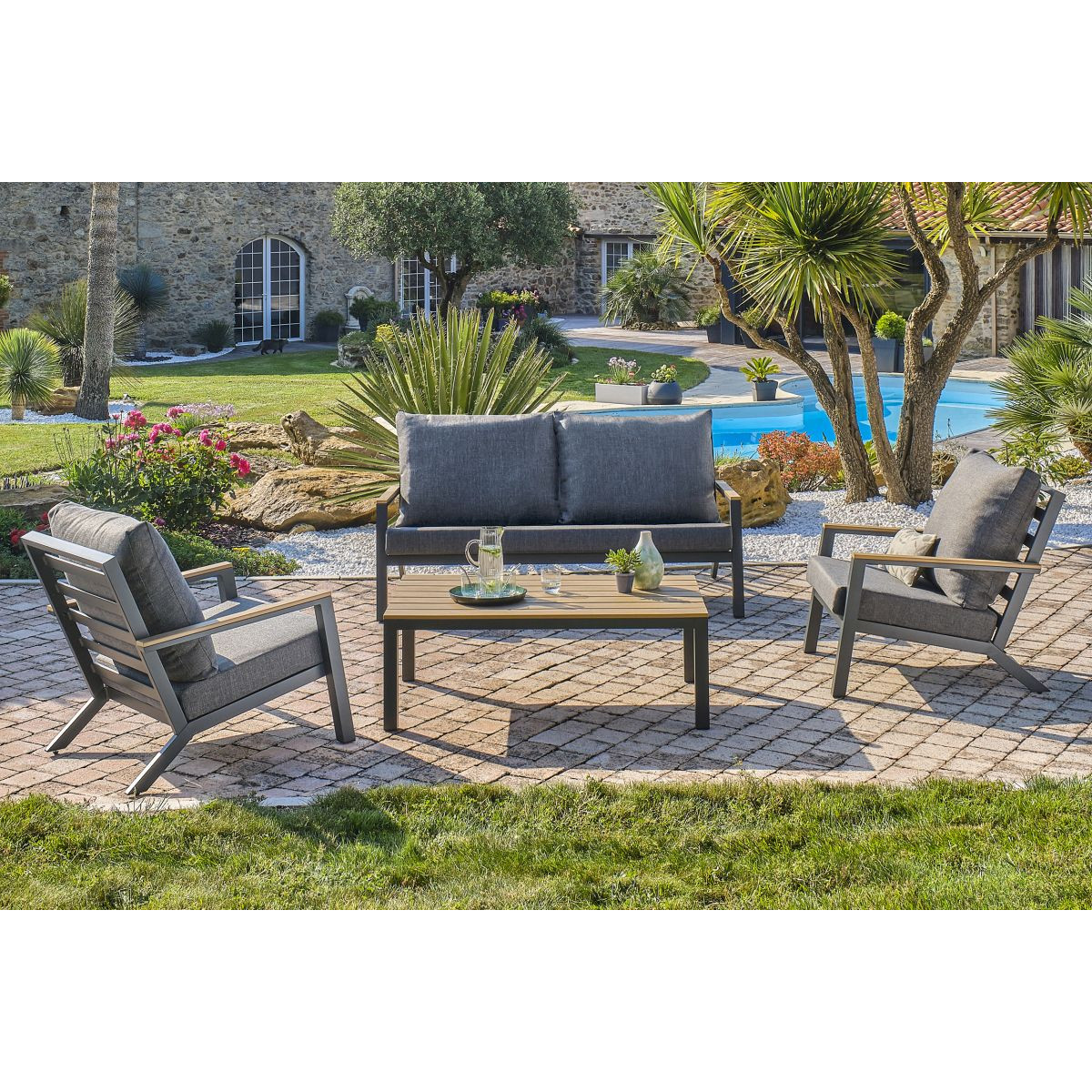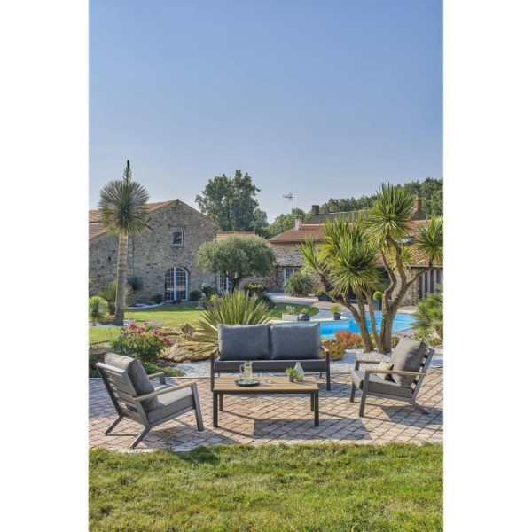 Salon de jardin KOMMOS, 5 places, matériau aluminium et plateau en composite, table, canapé, fauteuil, à monter, garantie 2 ans
