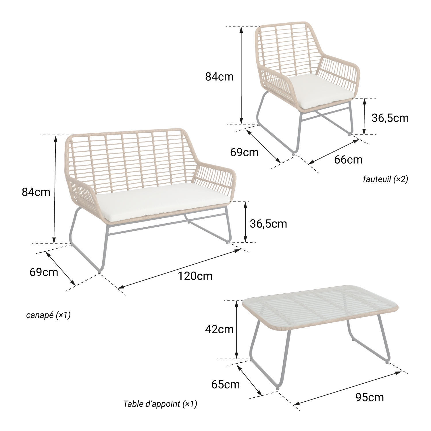 - Fauteuils : P 69 × l 66 × H 84cm
