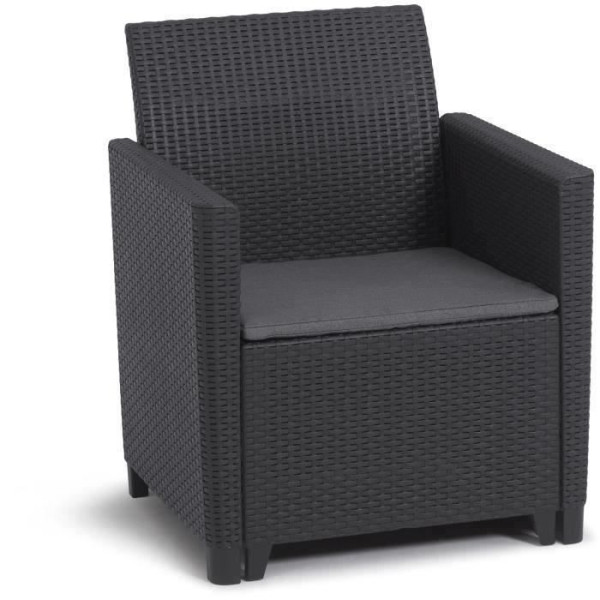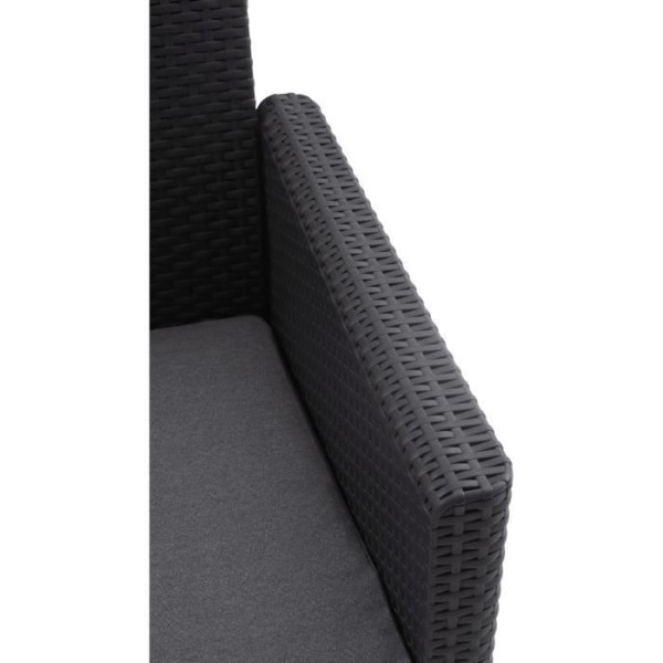 Aménagez votre coin détente avec le salon de jardin MARIE en résine effet rotin tressé noir pour 4 personnes. Il est composé d'une banquette 2 places (L113 x P65 x H74 cm), de 2 fauteuils (L63 x P65 x 74 cm) fournis avec des coussins d’assise et d'une table basse (L58.5 x P58.5 x H43 cm). Vous apprécierez sa légèreté qui lui permet d’être déplacé et rangé très facilement. Ce mobilier d’extérieur résiste aux intempéries et ne se décolore pas grâce à son traitement anti-UV. Il se nettoie facilement. Il est fabriqué en Europe et garanti 2 ans.