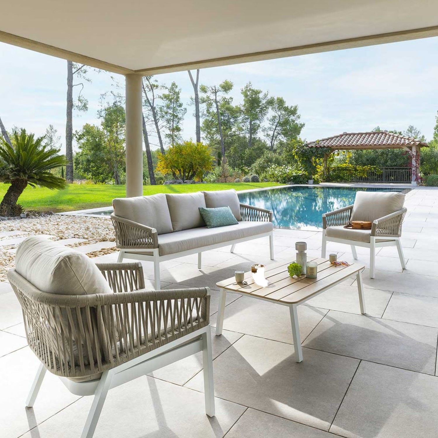 À l'arrivée du beau temps, détendez-vous confortablement à l'extérieur avec le salon de jardin Oriengo. Installé sur votre terrasse, le salon de jardin Oriengo apportera une note moderne à votre décoration extérieure. Il est composé d'un canapé trois places, de deux fauteuils et d'une table basse avec un plateau en bois verni certifié FSC issu de forêts gérées de façon responsable. La chaîne de production, allant du producteur au consommateur, est également certifiée FSC. Les dossiers en corde ajoutent une touche d'originalité à l'ensemble. Avec ses cinq places confortables, le salon de jardin Oriengo est la promesse de vivre d'excellents moments avec vos invités. Vous adorerez y passer des heures à vous prélasser ou à déguster un apéritif. La structure en aluminium traité époxy résiste à la rouille. Les coussins sont déhoussables pour faciliter le nettoyage. Pendant l'hiver, remisez votre mobilier de jardin à l'abri et protégez-le avec une housse.