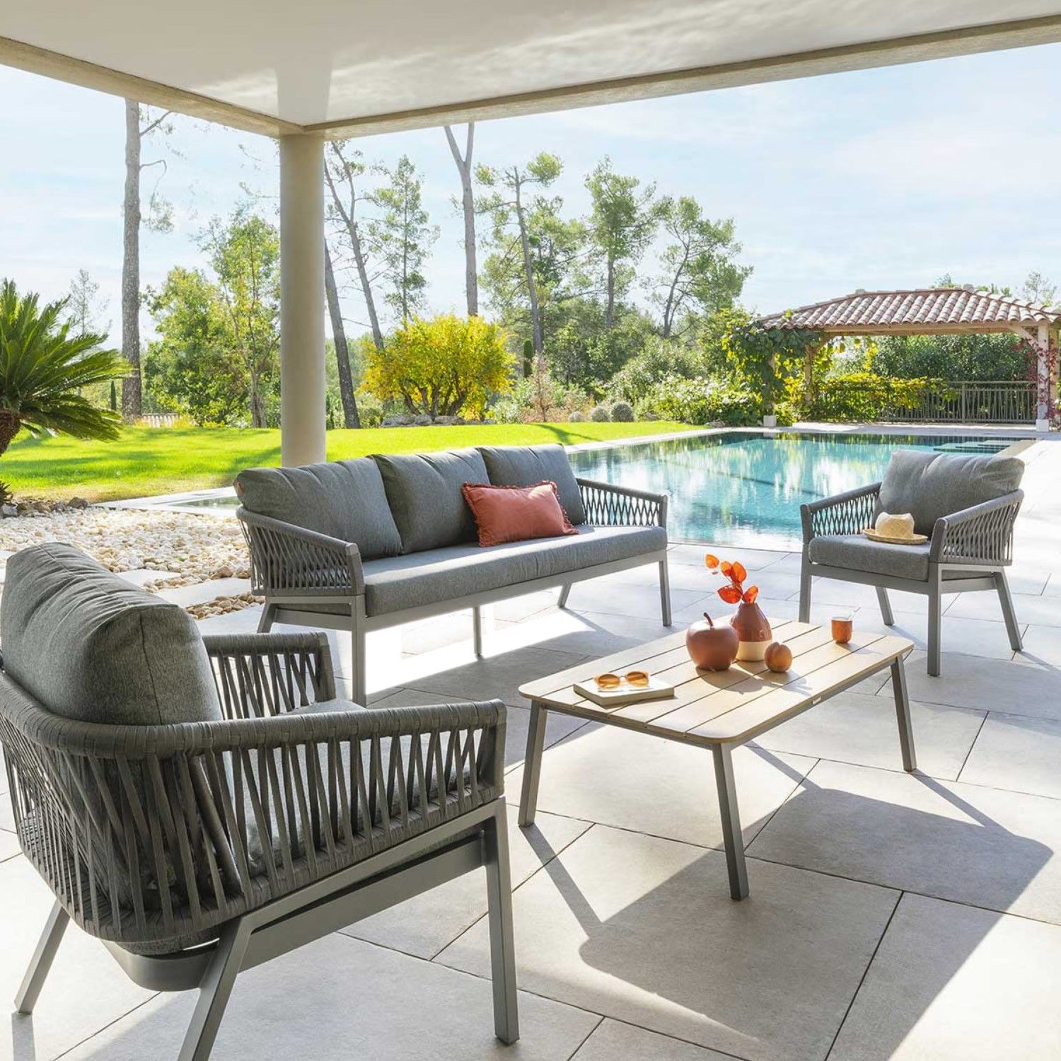 À l'arrivée du beau temps, détendez-vous confortablement à l'extérieur avec le salon de jardin Oriengo. Installé sur votre terrasse, le salon de jardin Oriengo apportera une note moderne à votre décoration extérieure. Il est composé d'un canapé trois places, de deux fauteuils et d'une table basse avec un plateau en bois verni certifié FSC issu de forêts gérées de façon responsable. La chaîne de production, allant du producteur au consommateur, est également certifiée FSC. Les dossiers en corde ajoutent une touche d'originalité à l'ensemble. Avec ses cinq places confortables, le salon de jardin Oriengo est la promesse de vivre d'excellents moments avec vos invités. Vous adorerez y passer des heures à vous prélasser ou à déguster un apéritif. La structure en aluminium traité époxy résiste à la rouille. Les coussins sont déhoussables pour faciliter le nettoyage. Pendant l'hiver, remisez votre mobilier de jardin à l'abri et protégez-le avec une housse.