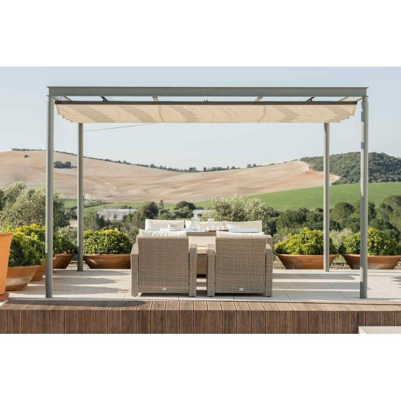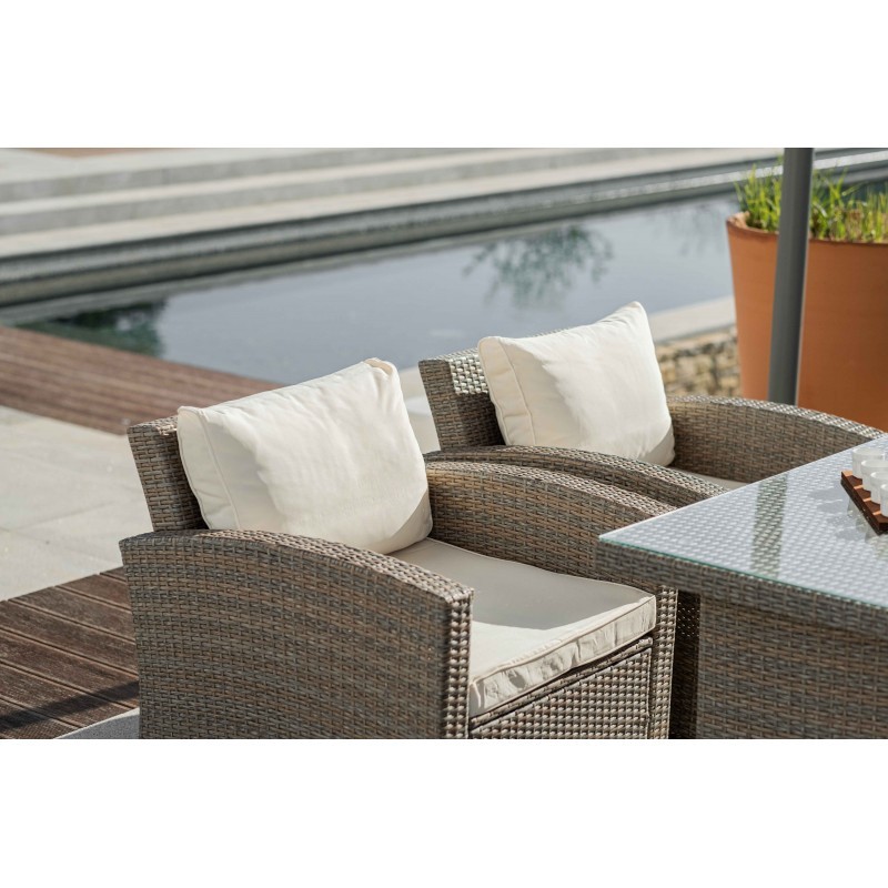 Des coussins sont inclus pour le confort. Son épaisseur est d'environ 7-8 cm pour les coussins d'assise et de 10-12 cm pour les coussins de dossier. Ce sont des coussins amovibles, remplis de mousse de polyuréthane avec des housses 100% polyester qui repoussent les liquides, avec un bord à cordon qui les rend très élégants.