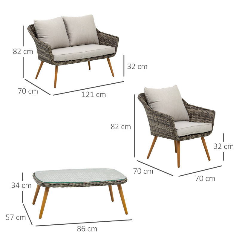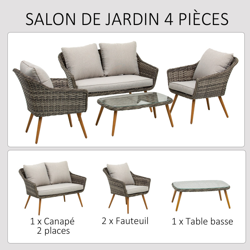 Design et élégant, le salon de jardin Martin de MYCOCOONING peut accueillir 4 personnes. La courbe des sièges ainsi que les pieds effilés et inclinés sont dans la plus pure tradition du style scandinave. Ce salon se compose de 2 fauteuils, d'un canapé 2 places et d'une table aux lignes arrondies. Le revêtement en résine tressée imite naturellement le rotin. Il a l'avantage de résister aux effets nocifs des UV et de l'humidité. Ainsi vous êtes assurés de conserver ce salon de jardin plus longtemps sans qu'il ne s'abîme. Les coussins d'assise et de dossiers sont également fournis. Ils sont d'un grand confort grâce à leur épaissie garniture en mousse haute densité. Les housses peuvent être retirées à l'aide du zip pour permettre de les nettoyer régulièrement. Le plateau de la table basse est en verre trempé d'une épaisseur de 5 mm. Très résistant, il pourra accueillir les verres de vos convives sans problème. Caractéristiques : - Ensemble salon de jardin complet doté d'un total de 4 pièces : 2 fauteuils, 1 canapé 2 places, 1 table basse aux belles lignes arrondies - Design scandinave dans un joli camaieu de gris avec pieds effilés, inclinés aspect bois idéal pour sublimer votre extérieur - Revêtement résine tressée imitation rotin mêlant sobriété et élégance au naturel - Structure robuste en métal époxy anticorrosion et résine de polyéthylène : matériaux de qualité résistant aux rayons UV, à l'humidité et ne nécessitant pas d'entretien particulier - Coussins d'assise et dossier grand confort fournis (revêtement polyester, garnissage mousse haute densité) - Assise profonde, dossier ergonomique, accoudoirs : grand confort d'utilisation - Entretien facile et pratique : plateau table basse en verre trempé épaisseur 5 mm, coussins d'assise zippés déhoussables - Idéal pour une installation aussi bien extérieure (jardin, terrasse, balcon) qu'intérieure (véranda) Spécifications : - Couleurs principales : gris - Matériaux principaux : métal époxy, résine tressé PE, tissu polyester, garnissage mousse - Dim. canapé 2 places : 121L x 70P x 82H cm - Dim. fauteuils : 70L x 70P x 82H cm - Dim. table basse : 86L x 57l x 34H cm - Dim. assise canapé 2 places : 106L x 56P cm (épaisseur : 7 cm) - Dim. assise fauteuil (sans coussin) : 55L x 56P x 32H cm - Dim. coussins d'assise : 55L x 50l cm - Charge max. recommandée : 220 Kg (canapé), 160 Kg (fauteuils), 30 Kg (table basse) - Livraison effectuée en 1 colis