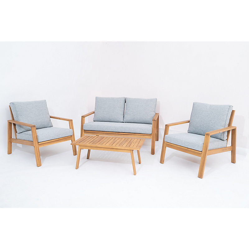 Salon de jardin Sidney, cette ensemble de jardin va embellir votre extérieur et y apporter une touche modernité. En bois d'acacias 100% Polyester - 180gr/m² Plateau table Acacia Fauteuil: 69x85x76cm Sofa: 126x85x76cm Table: 90x50x35cm