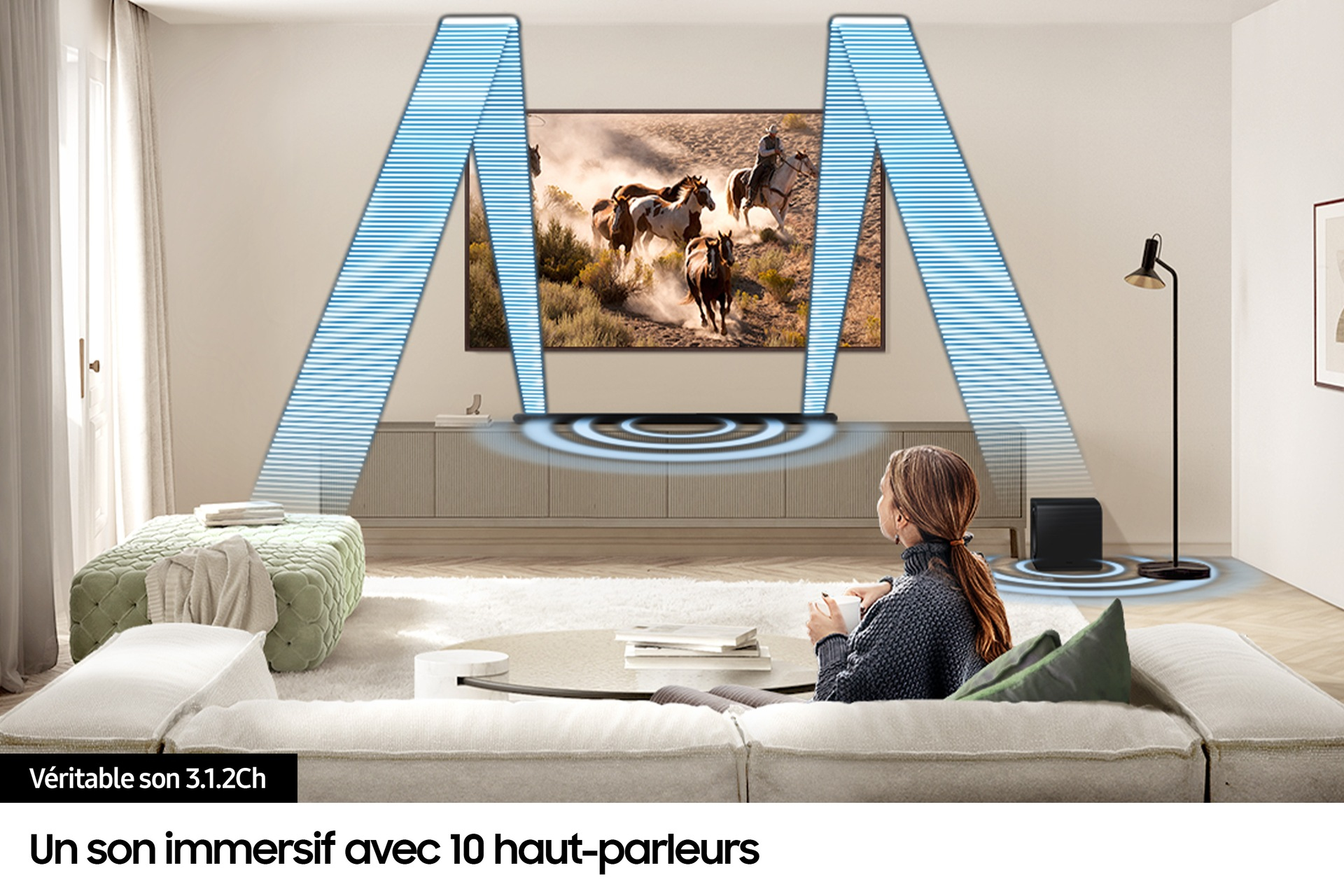 Profitez d'une véritable immersion grâce aux 10 haut-parleurs, dont un haut-parleur central pour des dialogues clairs et des haut-parleurs verticaux pour les effets surround. Grâce au caisson de basse sans fil inclus, profitez des basses riches et profondes.