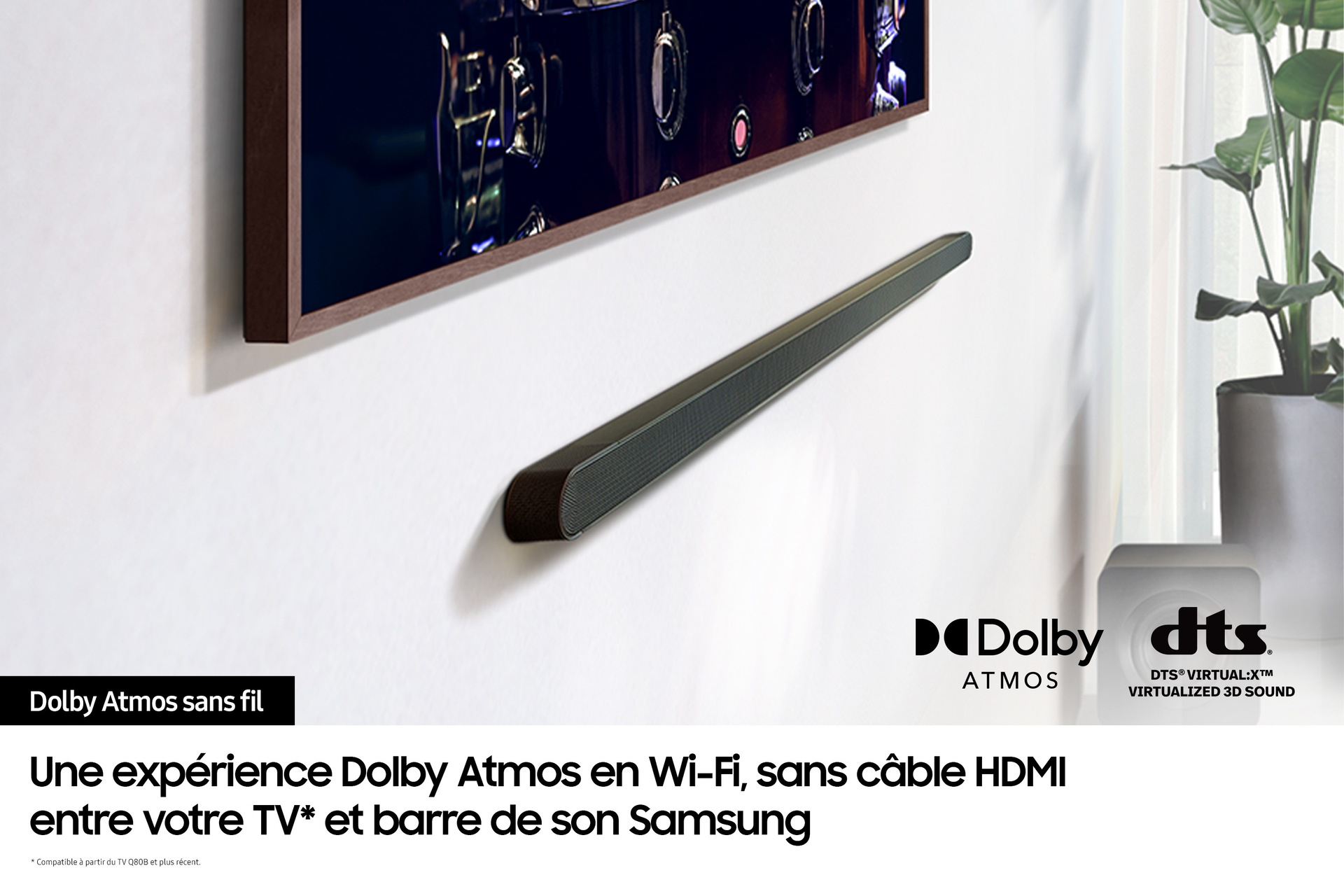 Les formats audio Dolby Atmos sont maintenant disponibles sans fil avec votre barre de son Samsung. Découvrez leffet de synergie créée par lexpérience 3D entre votre TV et barre de son Samsung, le tout sans aucun câble.