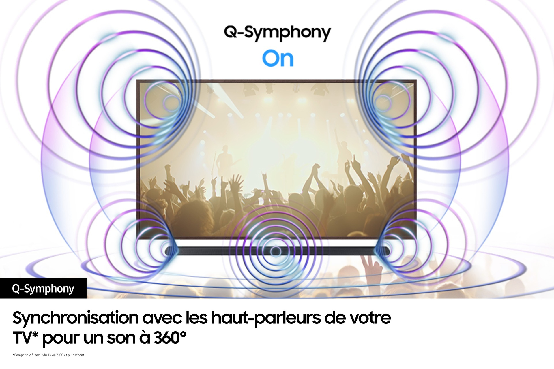 La technologie unique Q-Symphony développée par Samsung permet de synchroniser les haut-parleurs de votre barre de son avec ceux de votre TV Samsung pour une expérience sonore sans précédent. Profitez d'une sensation dimmersion acoustique exceptionnelle.