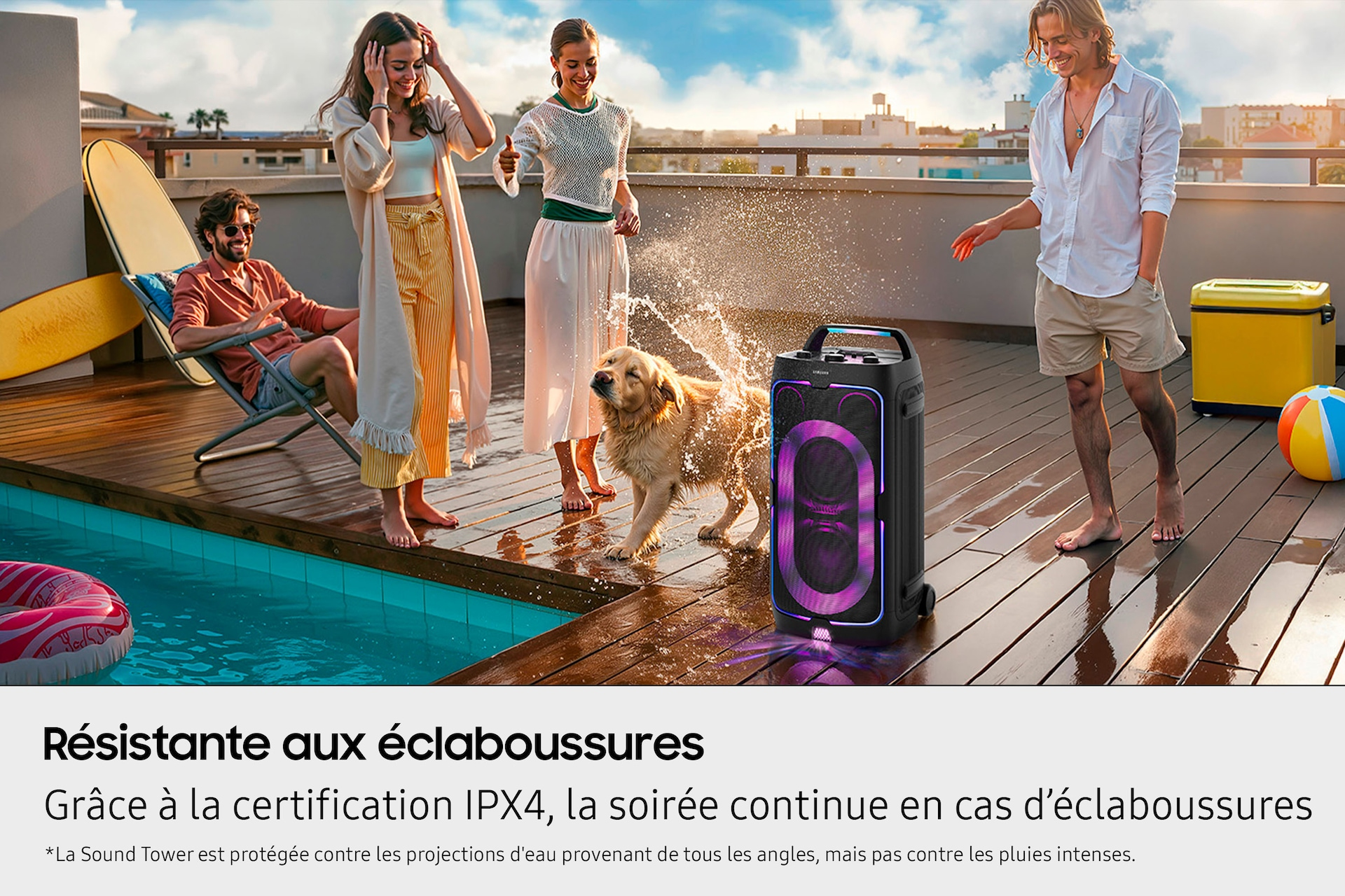 Profitez de votre enceinte en extérieur sans souci. Grâce à la certification IPX4, la soirée continue même en cas de pluie ou d'éclaboussures accidentelles de n'importe quel angle.