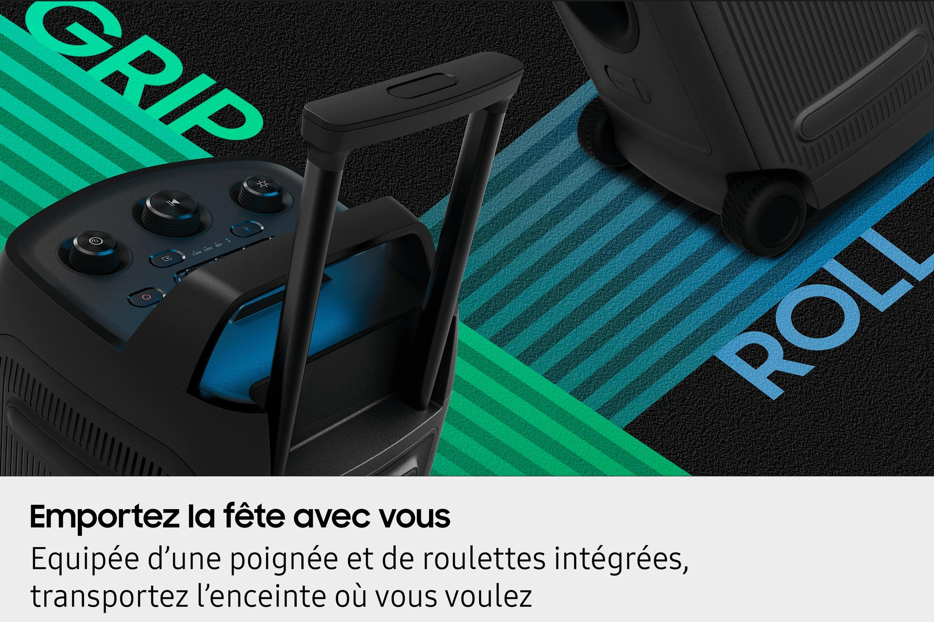 Emportez la fête partout où vous allez. Grâce à ses roulettes intégrées et à sa poignée télescopique réglable sur cinq niveaux différents, la Sound Tower est facilement transportable, ce qui la rend idéale pour une utilisation en extérieur.
