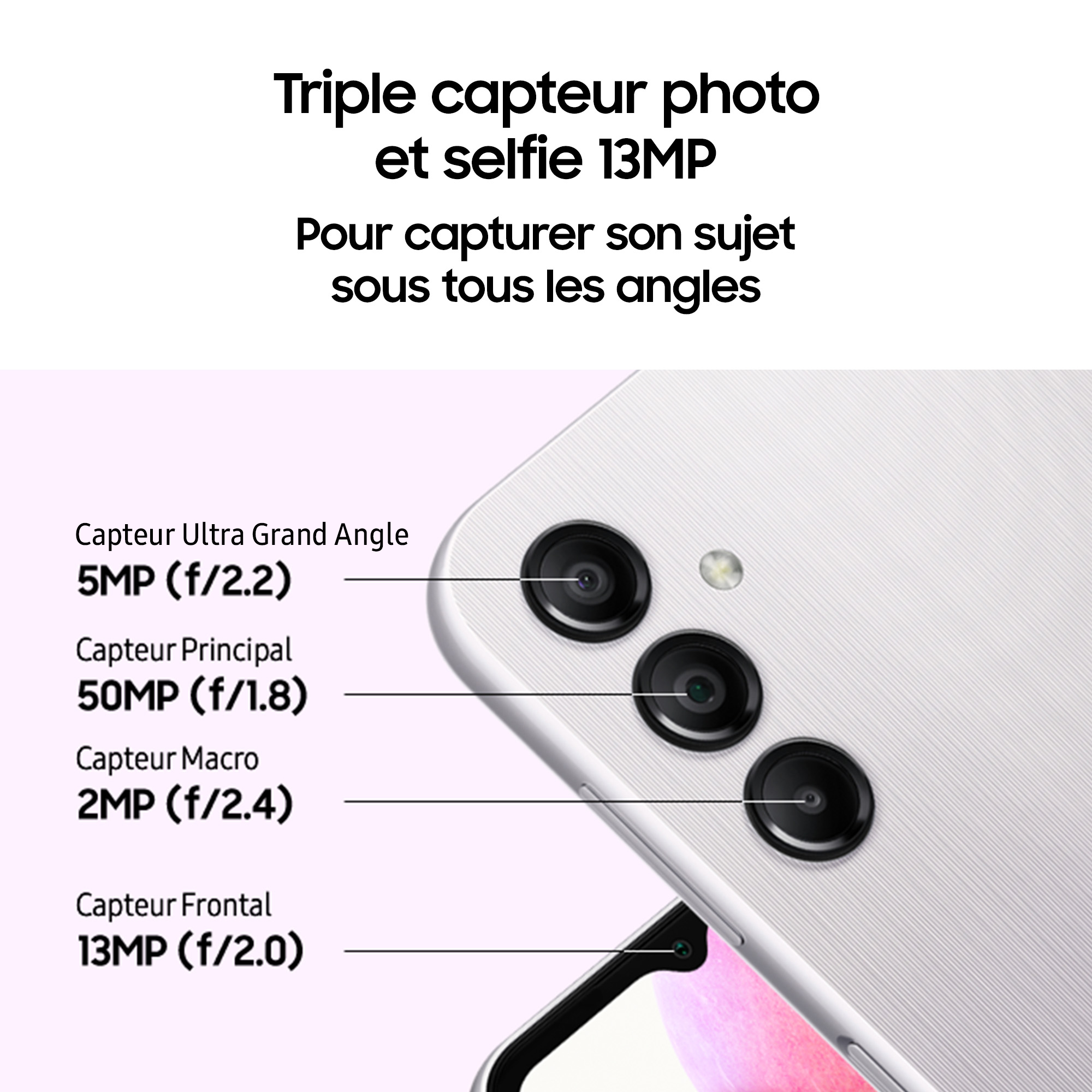 Voici le nouveau Galaxy A14. Profitez d’un écran 6,6’’ et sa très haute définition (FHD+) pour regarder de vos films et séries dans de bonnes conditions. Avec son triple capteur photo, changez d’angle de vue en passant du capteur principal de 50 MP à l’ultra grand angle et rapprochez-vous du détail avec le capteur macro. Pour photographiez votre meilleur profil, utilisez la caméra selfie de 13MP. Conserver toutes vos photos, vidéos et fichier sur les 64Go de stockage, ou rajouter jusqu’à 1To grâce à une carte microSD. Une fois la journée terminée, il vous reste encore de la batterie pour le lendemain grâce à ses deux jours d’autonomie.