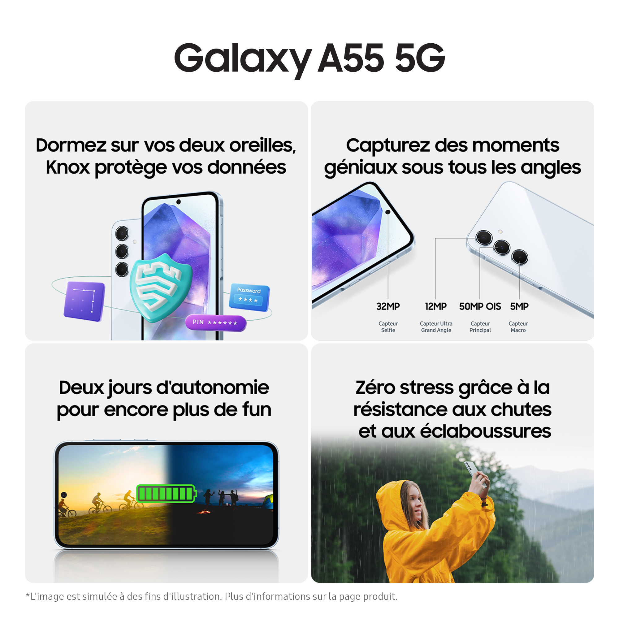 Découvrez le nouveau Samsung Galaxy A55 5G : le smartphone qui allie élégance, performance et polyvalence pour répondre à tous vos besoins. Arborant un design moderne et sophistiqué aux couleurs pop et tendances, le Galaxy A55 5G est le compagnon idéal pour ceux qui recherchent à la fois style et fonctionnalités. Son écran Super AMOLED de 6,6’’ en très haute définition (FHD+) vous offre une expérience visuelle immersive, vous permettant de profiter pleinement de vos contenus préférés. Capturez tous vos souvenirs avec précision grâce à son triple capteur photo et sa caméra selfie de 32 MP, garantissant des photos et vidéos nettes dans toutes les conditions, de jour comme de nuit. Stockez-les facilement avec le stockage de 128 ou 256 Go, extensible jusqu'à 1 To. Grâce à son processeur performant Exynos 1480 et à sa mémoire RAM généreuse de 8 Go, le Galaxy A55 5G vous assure une fluidité d'utilisation. Ne vous laissez pas arrêter par une batterie faible. Avec une batterie longue durée allant jusqu’à 2 jours et une charge rapide de 25W, ce smartphone est prêt à vous suivre partout, quel que soit votre rythme de vie. Que vous cherchiez à capturer des moments inoubliables, à rester productif en déplacement ou à vous divertir avec vos contenus préférés, le Samsung Galaxy A55 5G est le choix parfait pour vous accompagner dans toutes vos aventures avec style.