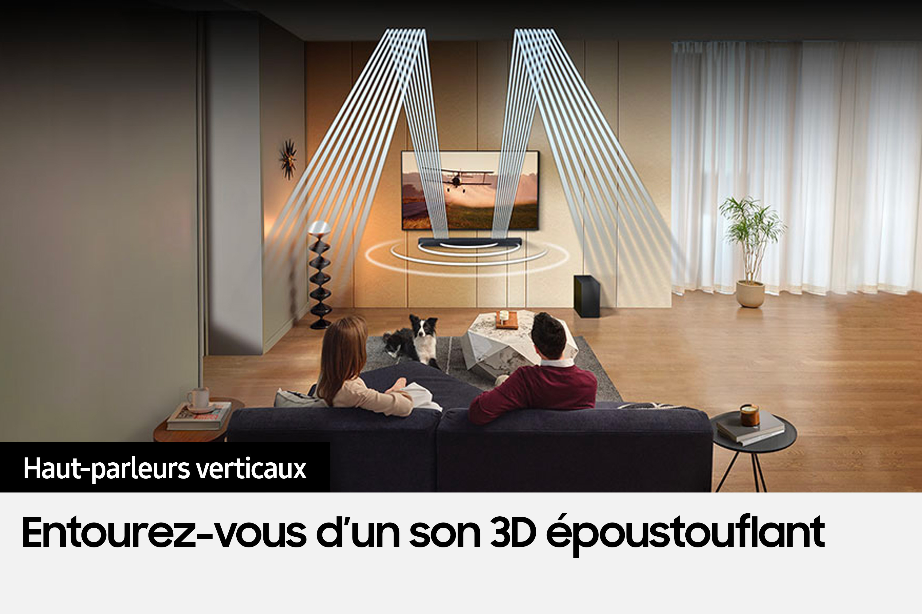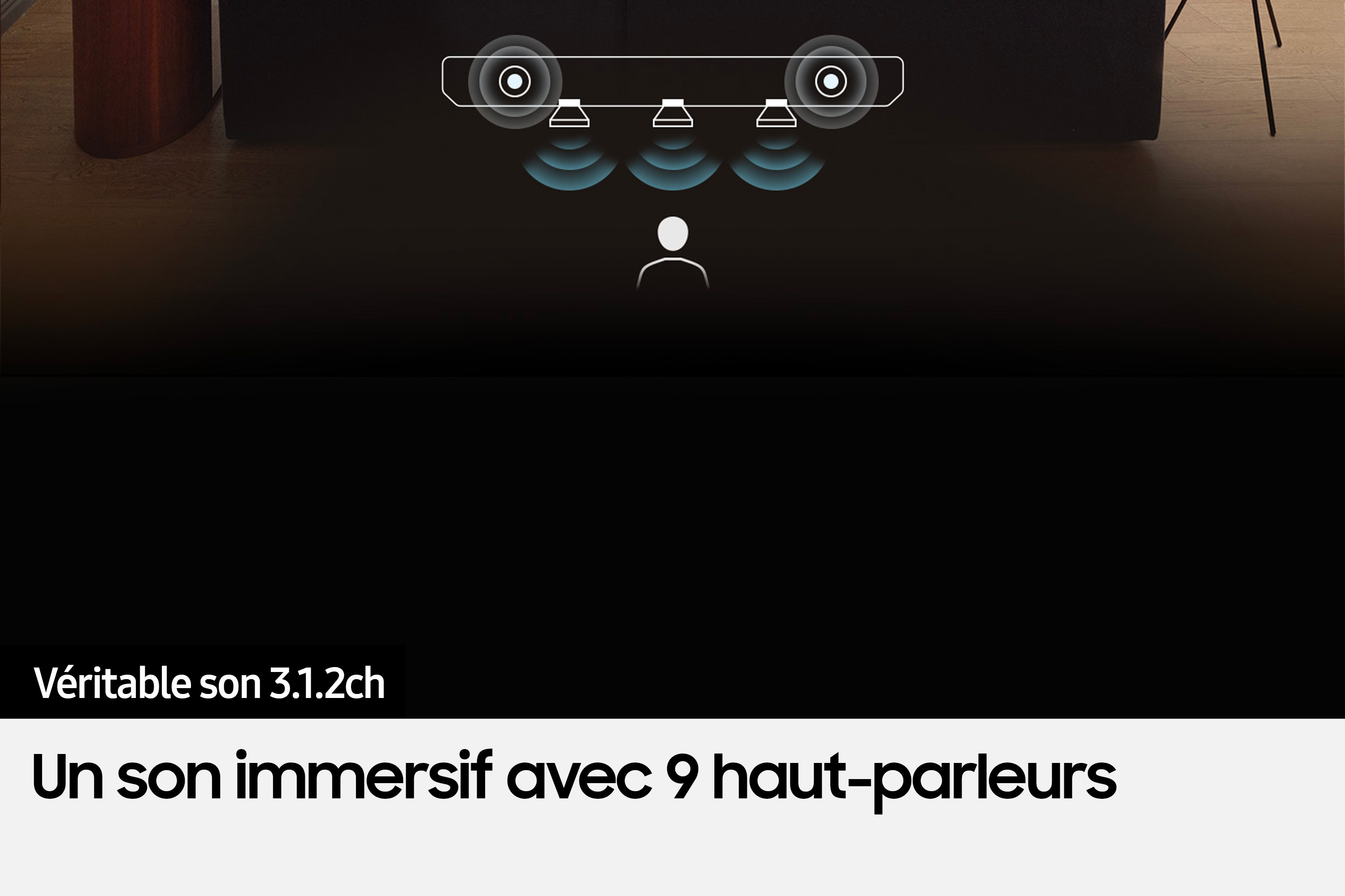 Profitez d'une expérience sonore riche et immersive grâce aux 9 haut-parleurs dont un haut-parleur central pour des dialogues clairs, et des haut-parleurs verticaux pour les effets Surround. Grâce au caisson de basse sans fil inclus, profitez des basses riches et profondes.