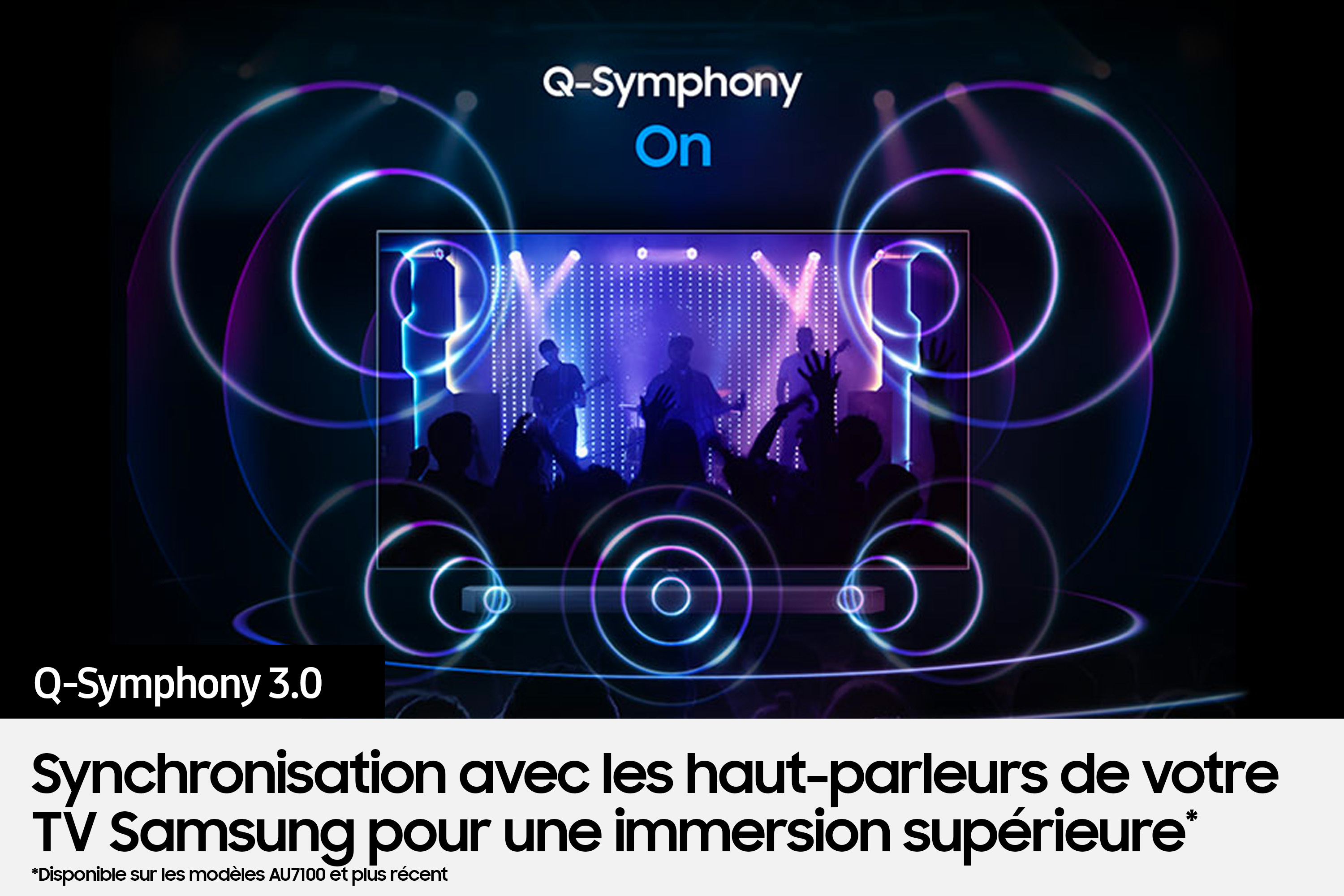 La technologie unique Q-Symphony développée par Samsung permet de synchroniser les haut-parleurs de votre barre de son avec ceux de votre TV Samsung pour une expérience sonore sans précédent. Profitez d'une sensation dimmersion acoustique exceptionnelle.