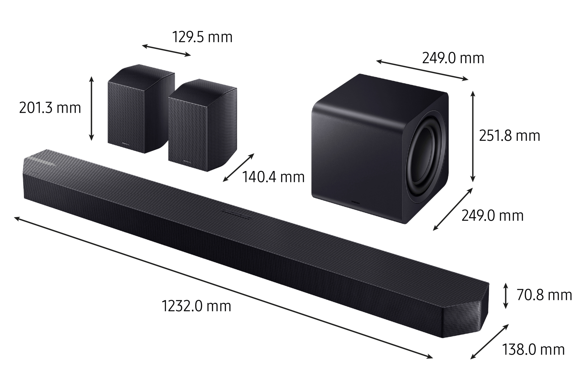 Ils sont intégrés stratégiquement dans la barre de son pour avoir une restitution sonore enveloppante. La barre de son est accompagnée d'un caisson de basse et des enceintes arrières pour compléter votre expérience cinéma à la maison.
