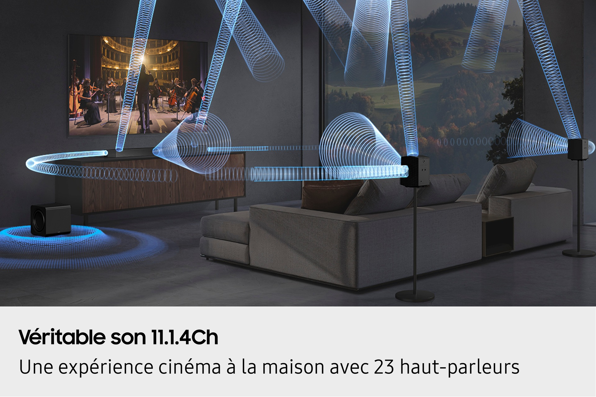 Profitez dune expérience audio riche et immersive avec 11 canaux surround, 4 canaux verticaux et un caisson de basse. Grâce aux enceintes arrières sans fil équipées des haut-parleurs verticaux et latéraux, le son voyage et se reflète sur le plafond pour une immersion à couper le souffle.