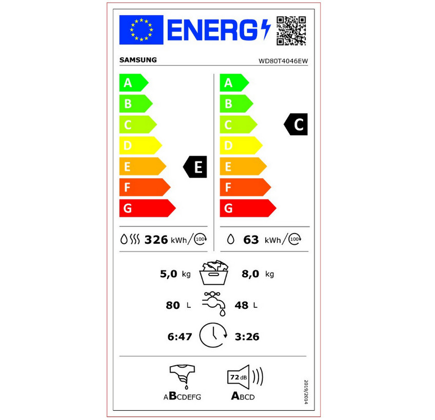 Libellé Samsung WD80T4046EW/EF machine à laver avec sèche linge Pose libre Charge avant Blanc