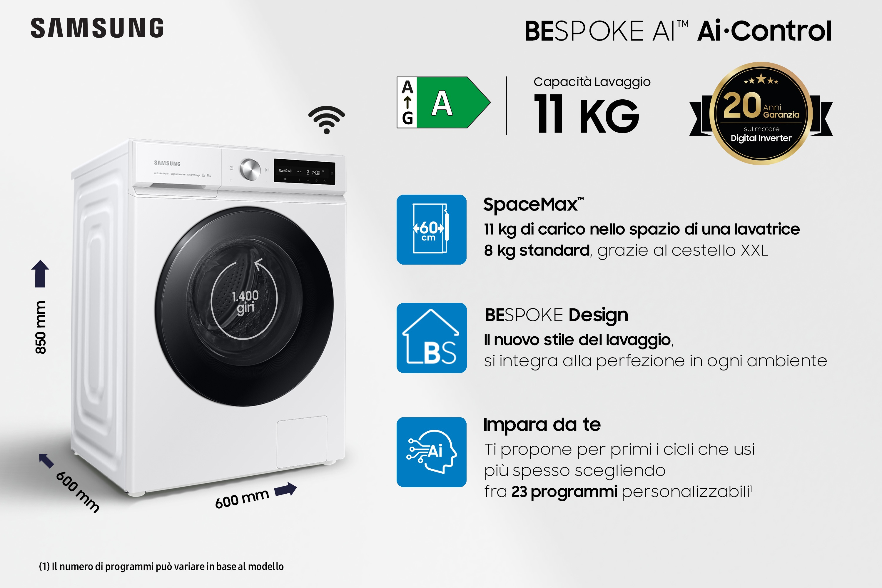 Malgré la capacité de 11kg, il ne prend pas plus de place que le précédent qui avait une capacité de 7 Kg. Il est silencieux et la communication avec le téléphone ou la montre via smarthing très pratique. Seul bémol le paramétrage des programmes personnalisés via le téléphone (ou le lave linge) est très compliquée à trouver et à paramétrer, certaines options en bloquent d'autres, on ne comprend pas pourquoi.