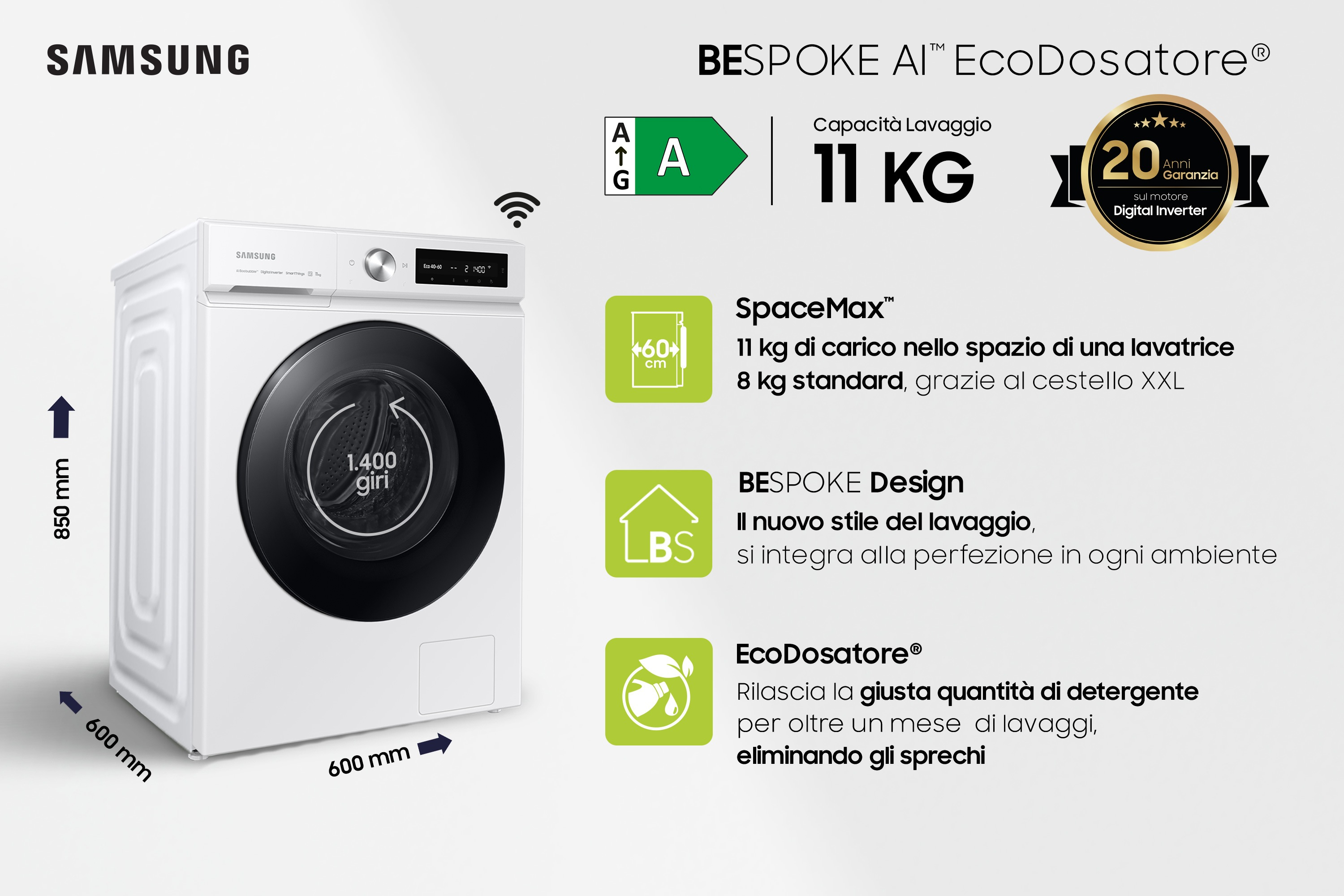 Profitez dune capacité extra large de 11KG dans des dimensions standard (60cm de profondeur). La technologie SpaceMax™ libère de lespace intérieur pour un tambour plus large, sans pour autant augmenter lencombrement extérieur. Vous pouvez profiter d'un grand tambour et laver des pièces volumineuses comme des couettes.