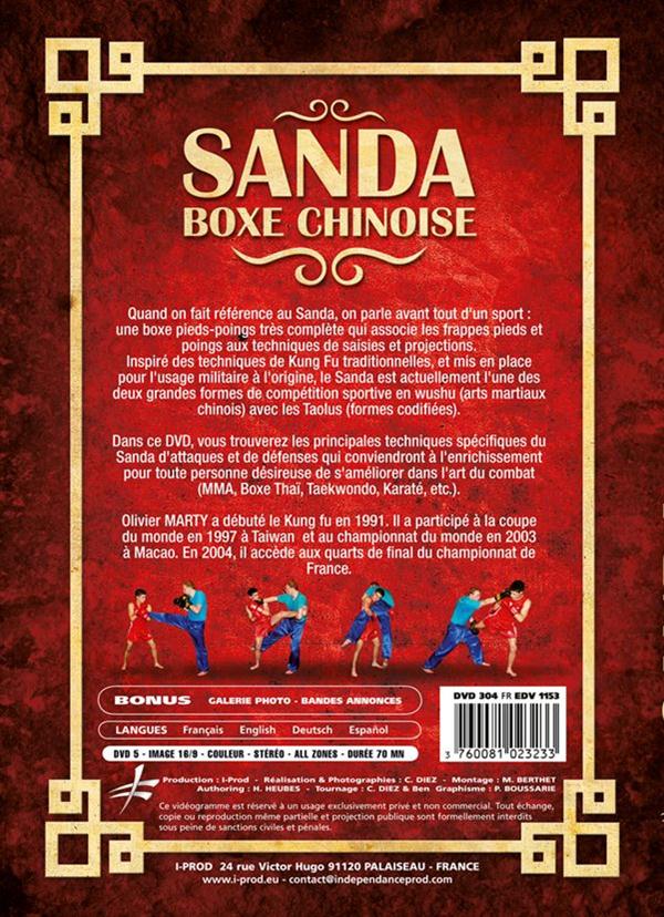 SANDA - BOXE CHINOISE Par Olivier Marty Le Sanda est une synthèse des différentes techniques du Wushu (poings, pieds, saisies et lutte) régies par un règlement, qui permet aux différents styles de Kung-fu de s'exprimer dans un cadre sportif. Dans ce DVD, vous trouverez les principales techniques spécifiques du Sanda d'attaques et de défenses qui conviendront à l'enrichissement pour toute personne désireuse de s'améliorer dans l'art du combat (MMA, Boxe Thaï, Taekwondo, Karaté, etc.). Langues : Français - English - Deutsch - Español Bonus : Galerie photo - Bandes annonces.