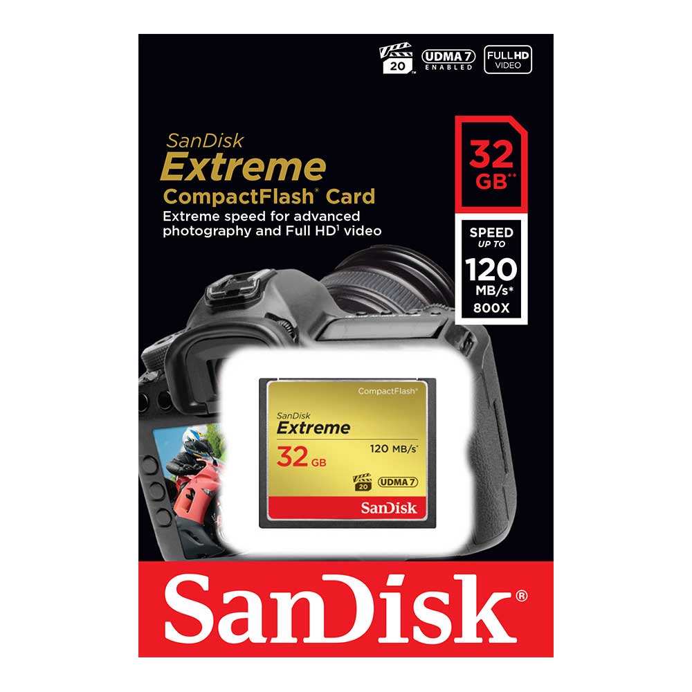 SanDisk 32GB Extreme. Capacité: 32 Go, Type de Carte Flash: CompactFlash, Vitesse de lecture: 120 Mo/s, Vitesse d'écriture: 85 Mo/s. Couleur du produit: Noir, Or, Rouge