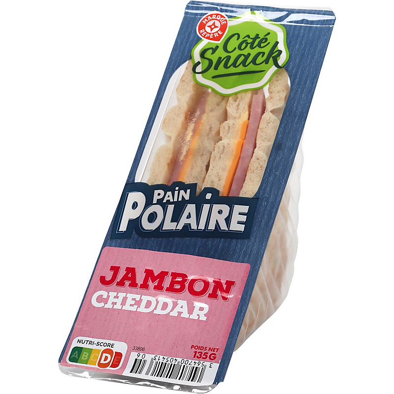 Ingrédients : Pain spécial polaire 48,2 % (farine de blé, eau, farine de seigle, sucre, levure, huile de colza, sel, levain de seigle dévitalisé déshydraté, gluten de blé) ; jambon cuit standard 29,6 % (jambon de porc 18,1 %, eau, acidifiant : lactate de sodium, dextrose, protéines de sang, sel, arômes naturels, stabilisants : triphosphates ; E450, antioxydant : ascorbate de sodium, conservateur : E250) ; cheddar orange fondu 11,1 % (cheddar orange 5,6 %, eau, amidon modifié de pomme de terre, beurre, protéines de lait, sel de fonte : E331, sel, colorant : extrait de paprika) ; mayonnaise allégée en matières grasses* (eau, huile de colza,  moutarde de Dijon (eau ; graine de moutarde ; vinaigre d'alcool ; sel), vinaigre d’alcool, amidon de maïs, jaune d'œuf, sucre, sel, jus de citron concentré).