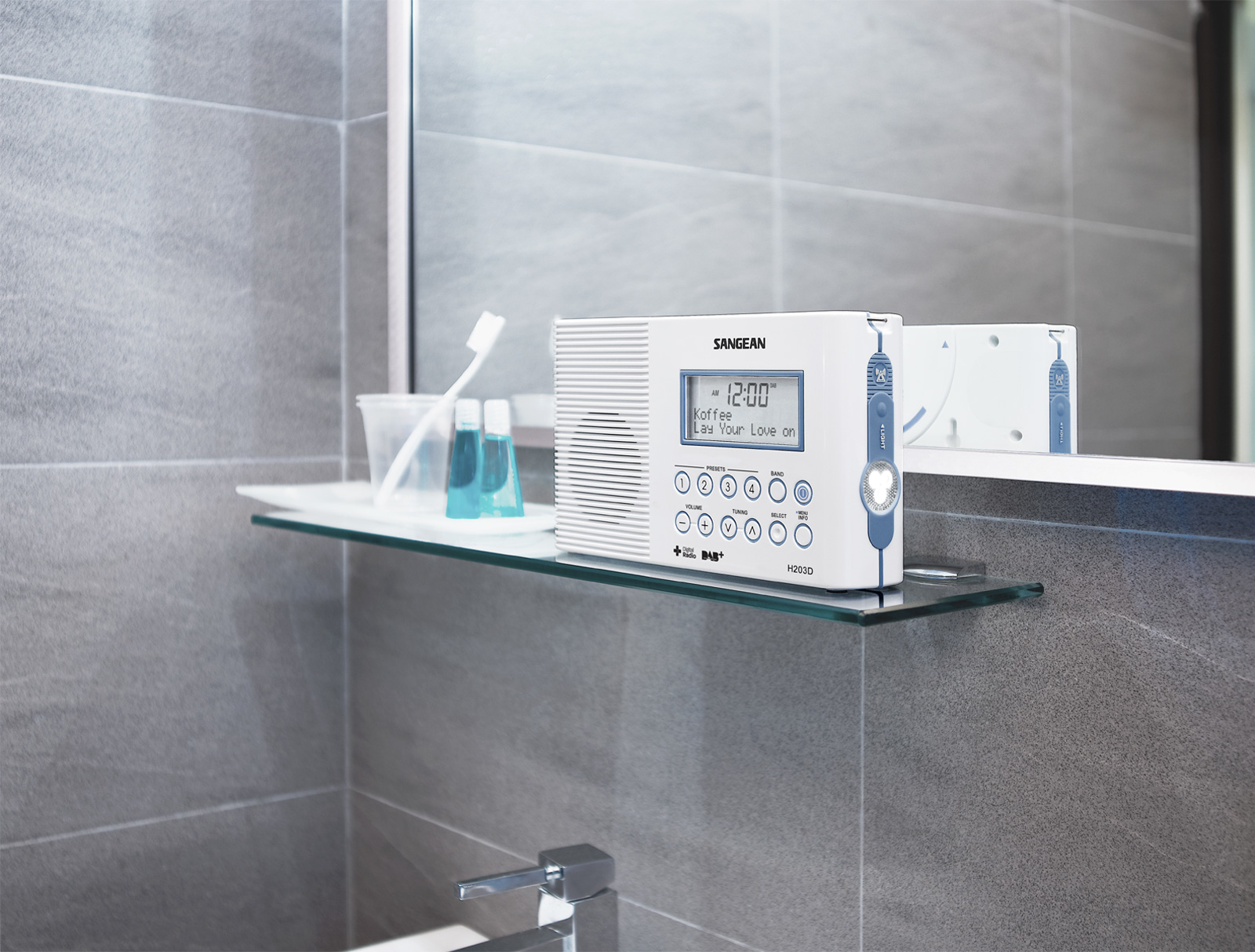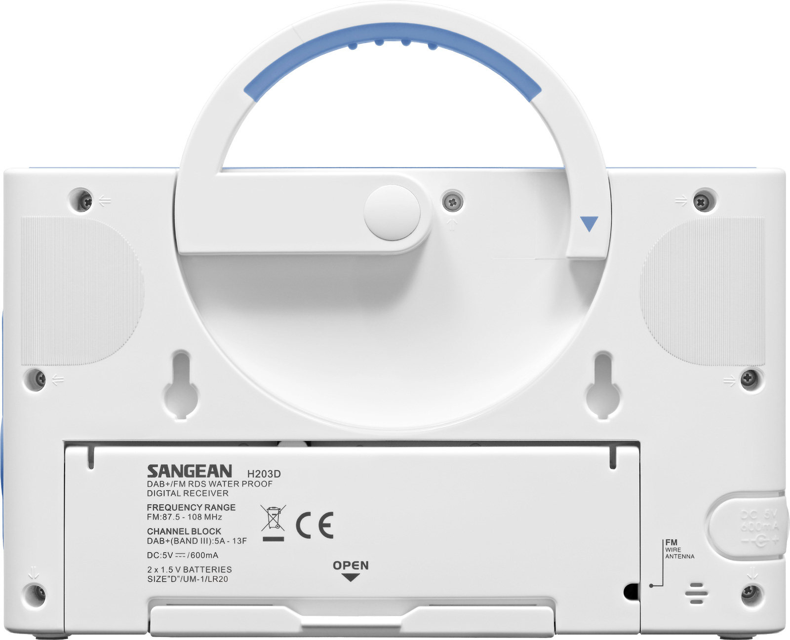 Sangean H203D. Radio: Personnel, Type de tuner: Numérique, Type de bandes supportées: DAB, FM. Puissance évaluée de RMS: 0,45 W. Type d'écran: LCD, Résolution de l'écran: 64,8 x 23,3 pixels. Couleur du produit: Blanc, Fonctions de protection: Résistant à l’eau. Tension des piles: 1,5 V