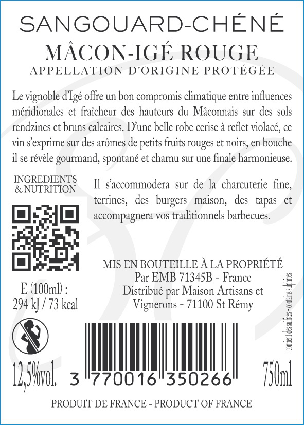 | Libellé | SANGOUARD-CHÉNÉ, 2024 - Mâcon-Igé AOP - Rouge - 75 cl |