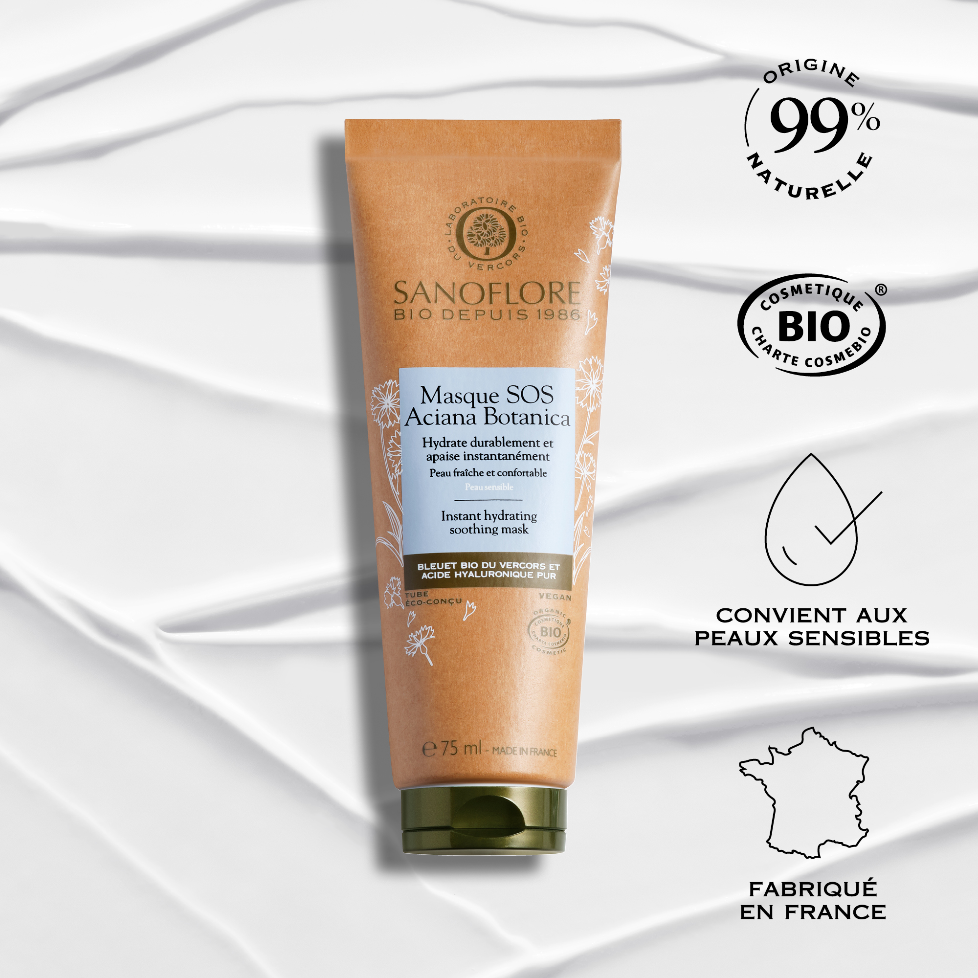 [HYDRATANT] La peau est hydratée de +54% (Mesure instrumentale après 30 min – 24 femmes). [APAISANT] La peau est apaisée dès la 1ère application. (Test consommateurs, 51 femmes.) [FORMULE NATURELLE ET BIO] enrichie en hydrolat de Bleuet bio du Vercors hydratant et apaisant, en Acide hyaluronique d'origine naturelle hydratant et protecteur et en Aloe Vera Bio à l'action hydratante et réparatrice de la barrière. [TEXTURE FRAÎCHE ET FONDANTE] Formulée spécifiquement pour les peaux sensibles et réactives. Appliquez en couche épaisse 2 fois par semaine pendant 10 minutes ou lorsque nécessaire. Testée sous contrôle dermatologique +54% d'hydratation immédiate.* *Test instrumental sur 24 femmes après 30 minutes.