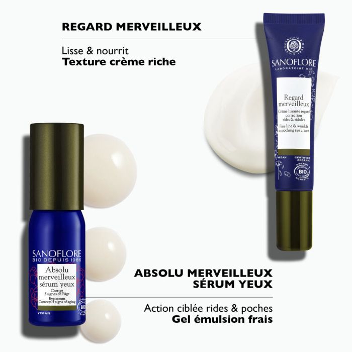 Regard Absolu merveilleux est le 1er contour des yeux naturel à l'efficacité cliniquement prouvée sur les rides profondes et marquées. Ce soin est formulé autour d'un complexe unique issu de la recherche avancée : le complexe bio merveilleux à l'action anti-âge combiné à l'extrait de caféine, actif spécifique du contour des yeux. Ce soin est testé sous contrôle dermatologique et ophtalmologique. Convient à tous les types de peaux même sensibles.