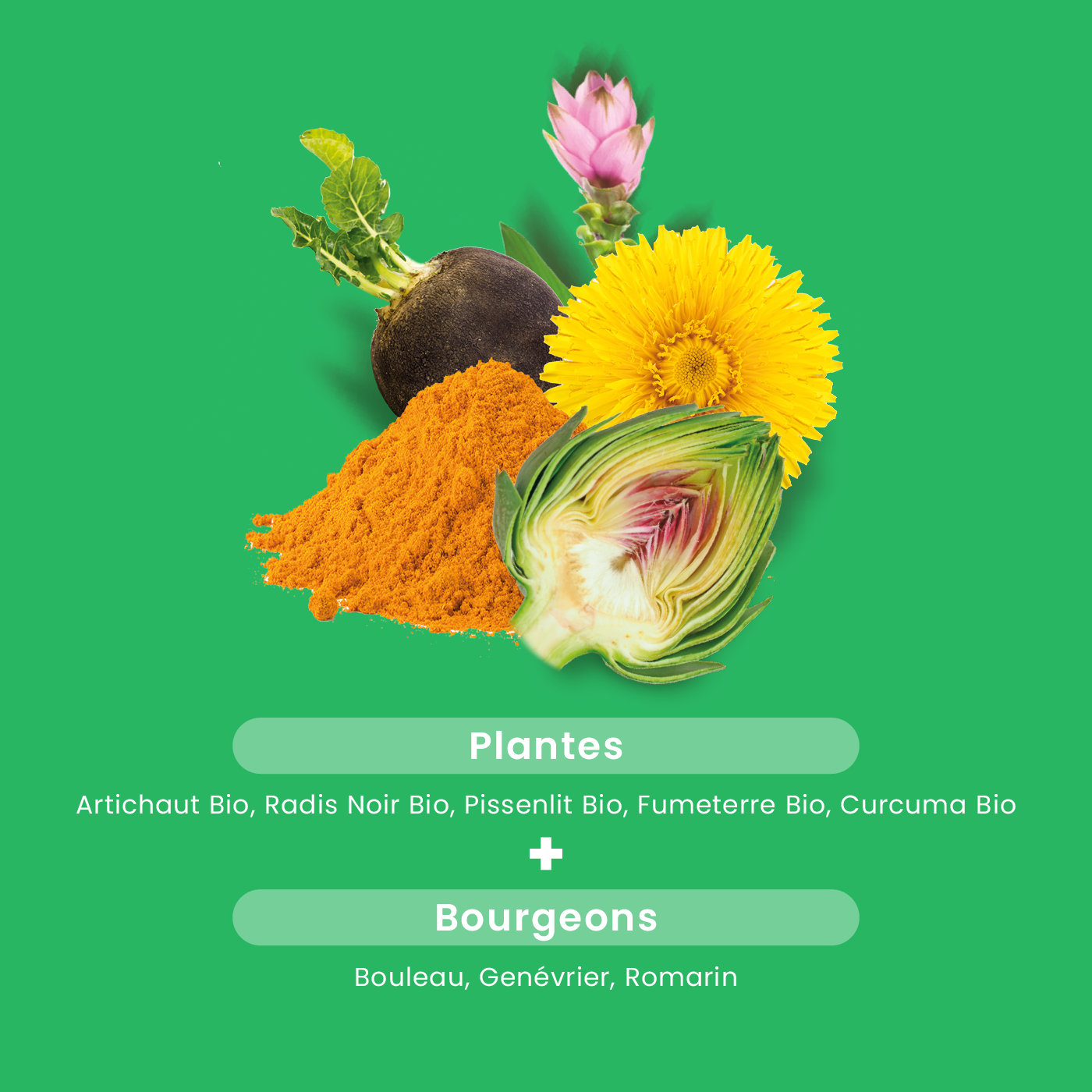 Ingrédients : Eau purifiée, extraits aqueux de : Radis noir** (Raphanus raphanistrum subsp. sativus (L.) Domin), Pissenlit** (Taraxacum campylodes G.E. Haglund), Fumeterre** (Fumaria officinalis L.), Curcuma** (Curcuma longa L.), extrait sec d’Artichaut** (Cynara scolymus L.), jus concentré de Citron**, arôme naturel de Romarin**, macérats