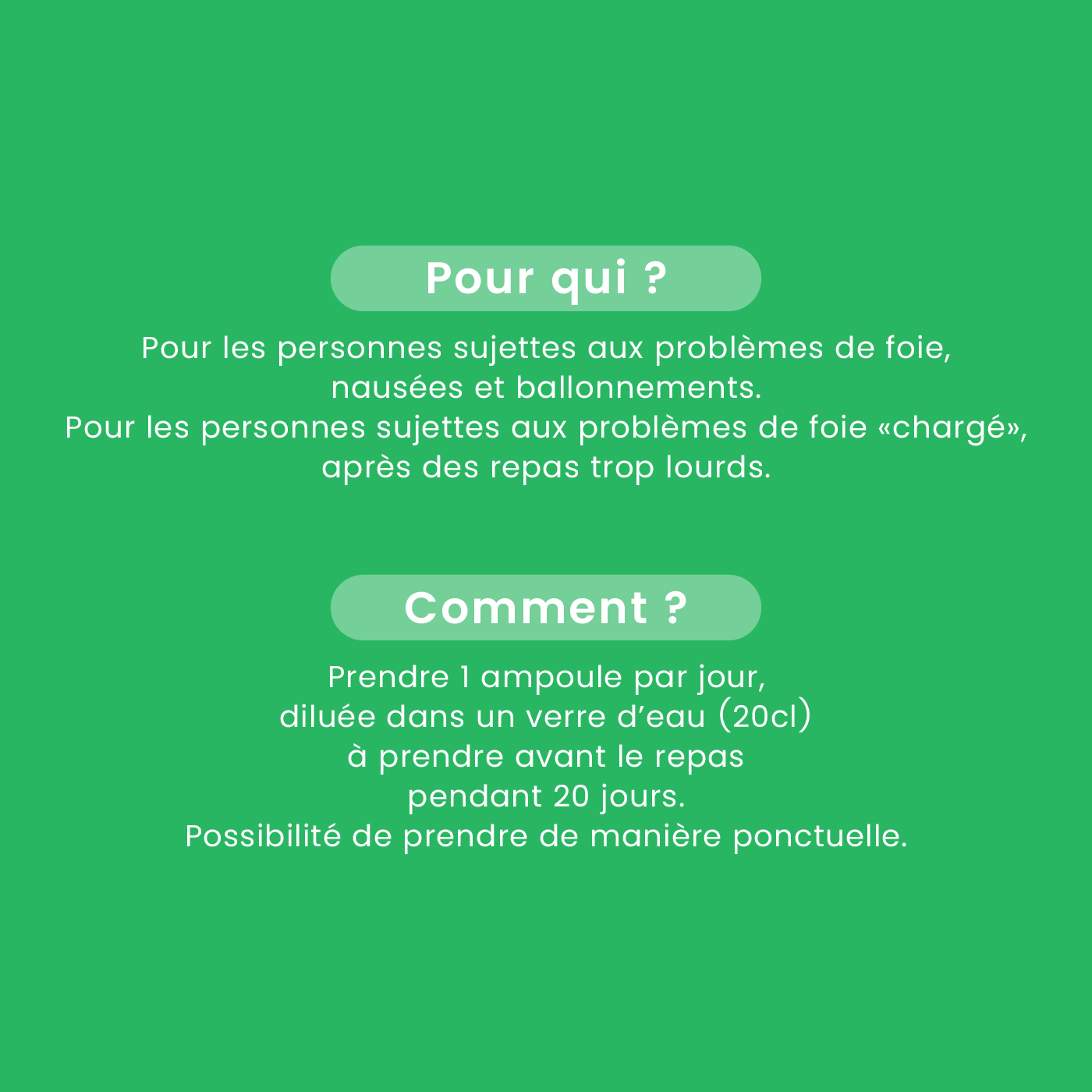 Problèmes de digestion ? Découvrez Bien-être du Foie 20 ampoules, notre complément alimentaire qui aide à faciliter la digestion au quotidien. Notre formule est fortement dosée en Artichaut, qui aide à détoxifier le corps et favorise le bon fonctionnement du Foie. Le Pissenlit agit sur le fonctionnement hépatique, le Radis Noir facilite la digestion difficile, le Curcuma est utilisé en cas de troubles digestifs et le Fumeterre a des propriétés dépuratives. En complément, notre formule est enrichie par un trio de bourgeons (Romarin, Bouleau et Genévrier), pour une efficacité renforcée. Notre produit est Bio, Végan et fabriqué en France !