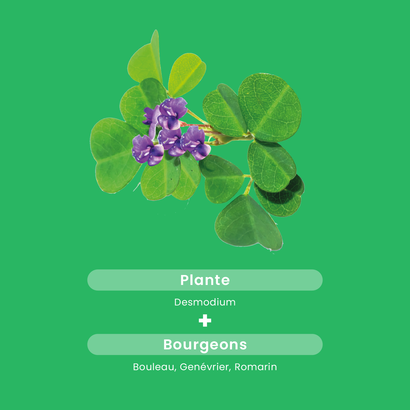 Ingrédients : Extrait sec de Desmodium (Desmodium adscendens (Sw.) DC.), agent de charge : gomme d’Acacia, enveloppe de la gélule d'origine végétale : hydroxypropylméthylcellulose, sucre de canne, farine de riz, amidon de riz, anti-agglomérant : carbonate de magnésium, macérat glycériné de bourgeon de Bouleau (Betula pubescens Ehrh.), macérat glycériné de jeune pousse de Genévrier (Juniperus communis L.), macérat glycériné de jeune pousse de Romarin (Rosmarinus officinalis L.).