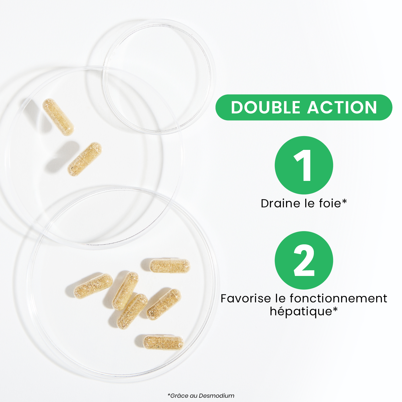 Problèmes hépatiques légers ? Découvrez Desmodium 2500 en format gélules, notre complément alimentaire qui favorise le bon fonctionnement du foie. Notre formule est la plus dosée en Desmodium du marché (2500 mg), qui aide à drainer le foie et favorise le fonctionnement hépatique. En complément, le trio de bourgeons Genévrier, Bouleau et Romarin favorise l'élimination des toxines et aide à protéger le foie. Notre produit est Végan et fabriqué en France !