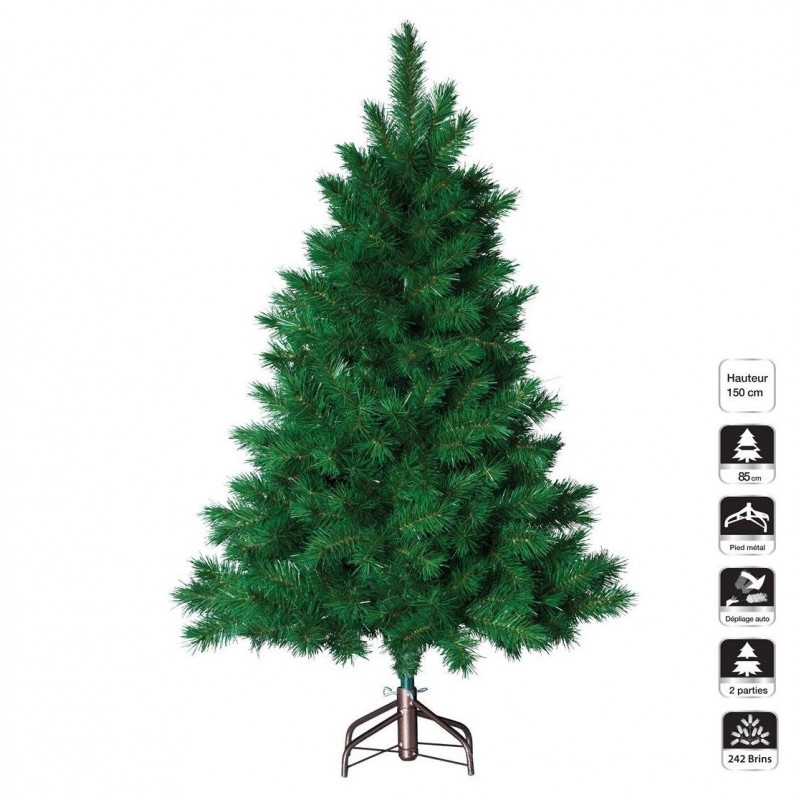 Beau sapin de Noà«l à la finition soignée et au rendu naturel. Nombreuses branches bien fournies : 242 brins. Pied métal fourni, stable sur ses 4 montants. Se démonte en 2 parties. Déploiement automatique des branches. En acier et plastique pvc. Coloris vert. Hauteur : 150 cm, largeur 85 cm. Poids 5,6 kg.