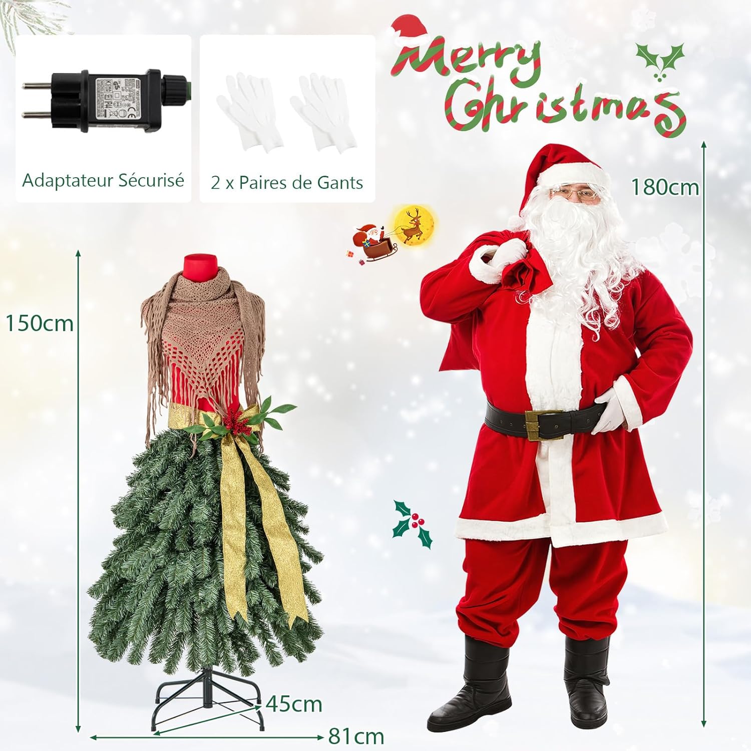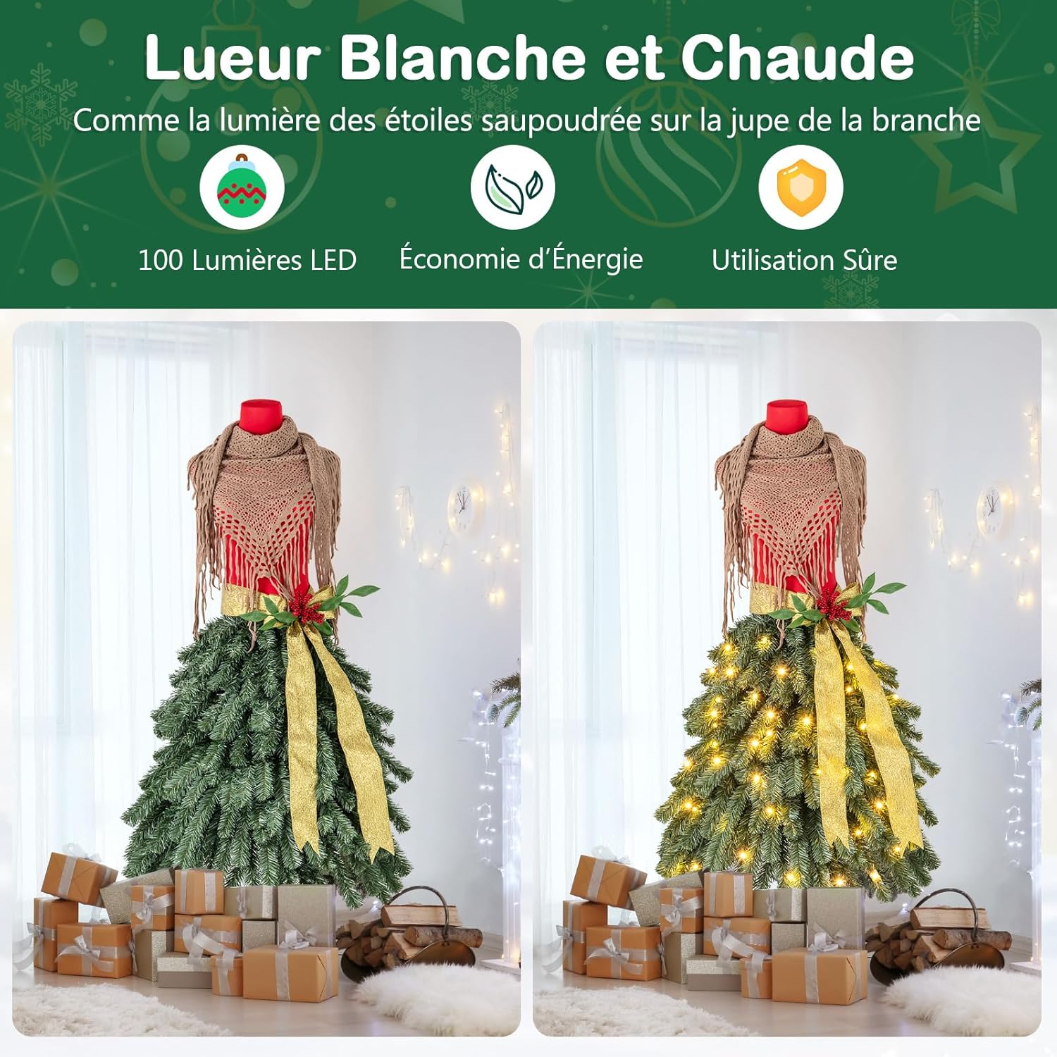 Parfait pour votre maison ou magasin, et incarnant une femme élégante, ce sapin de Noël de 150 cm est orné de baies rouges, de feuilles artificielles, d'un ruban doré et d'une écharpe élégante, créant un style sophistiqué. Ses 248 pointes de branches sont façonnées en une jupe délicate, évoquant une atmosphère festive. Les 100 LED pré-éclairées émettent une lueur blanche chaude saupoudrée sur la jupe de la branche. Fabriqué à partir de PVC de qualité, il est sûr et durable. Le support métallique pliable est doté d'un boulon préinstallé pour un alignement idéal des trous.