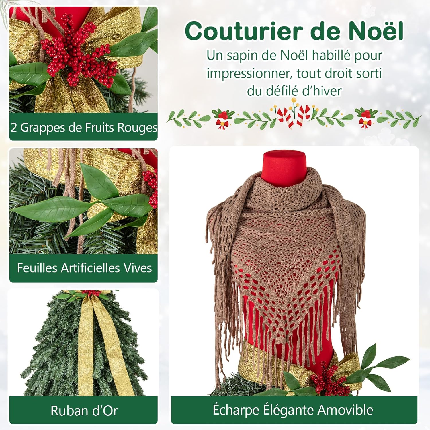 - Look unique — L'arbre de Noël de 150 cm reflète la grâce d'une dame élégante. Orné de 2 grappes de baies rouges, de feuilles artificielles vives, d'un ruban doré chic et d'une écharpe élégante amovible, cet arbre ajoute une touche sophistiquée à n'importe quel espace.