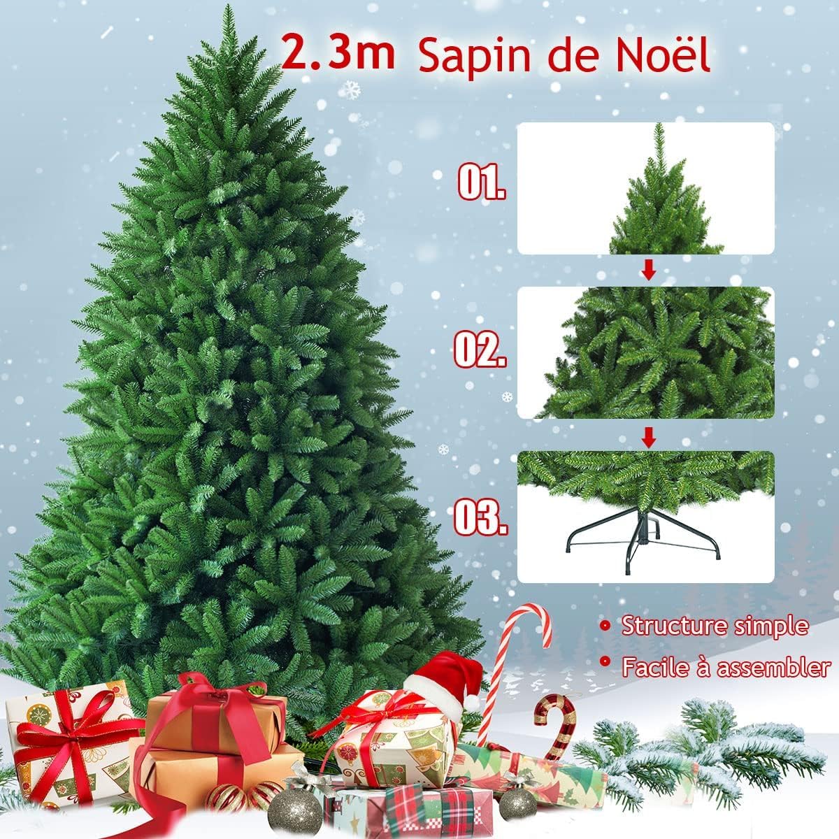 Sapin de Noël 225 cm structure simple en 3 sections et instructions détaillées facilitent l’assemblage