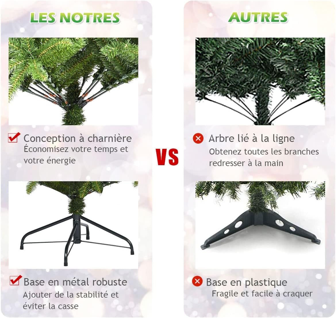 - Installation facile : Avec la conception pratique de la charnière, notre sapin de Noël peut être facilement ouvert automatiquement. De plus, la structure simple en 3 sections et les instructions détaillées vous permettent de terminer l’assemblage rapidement.