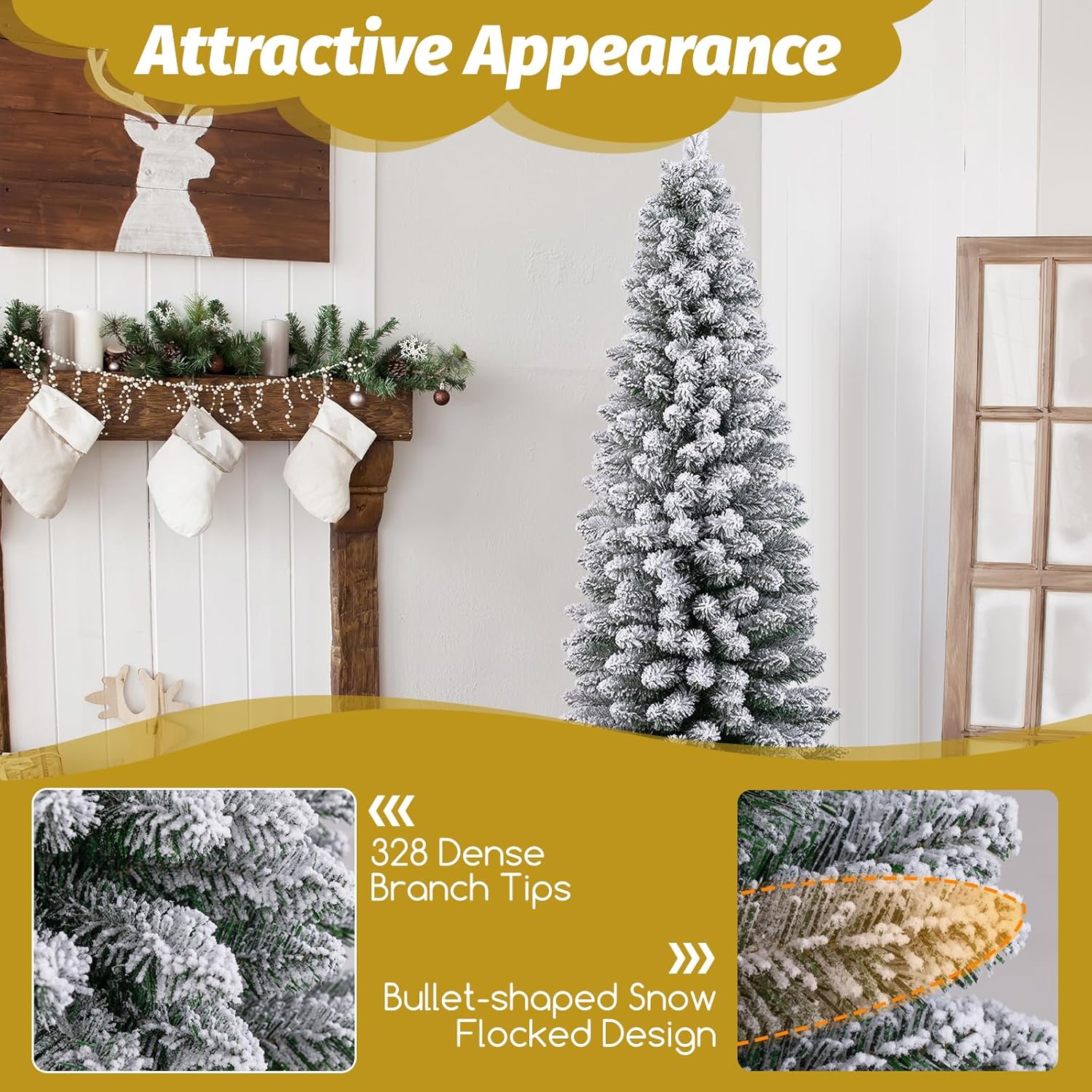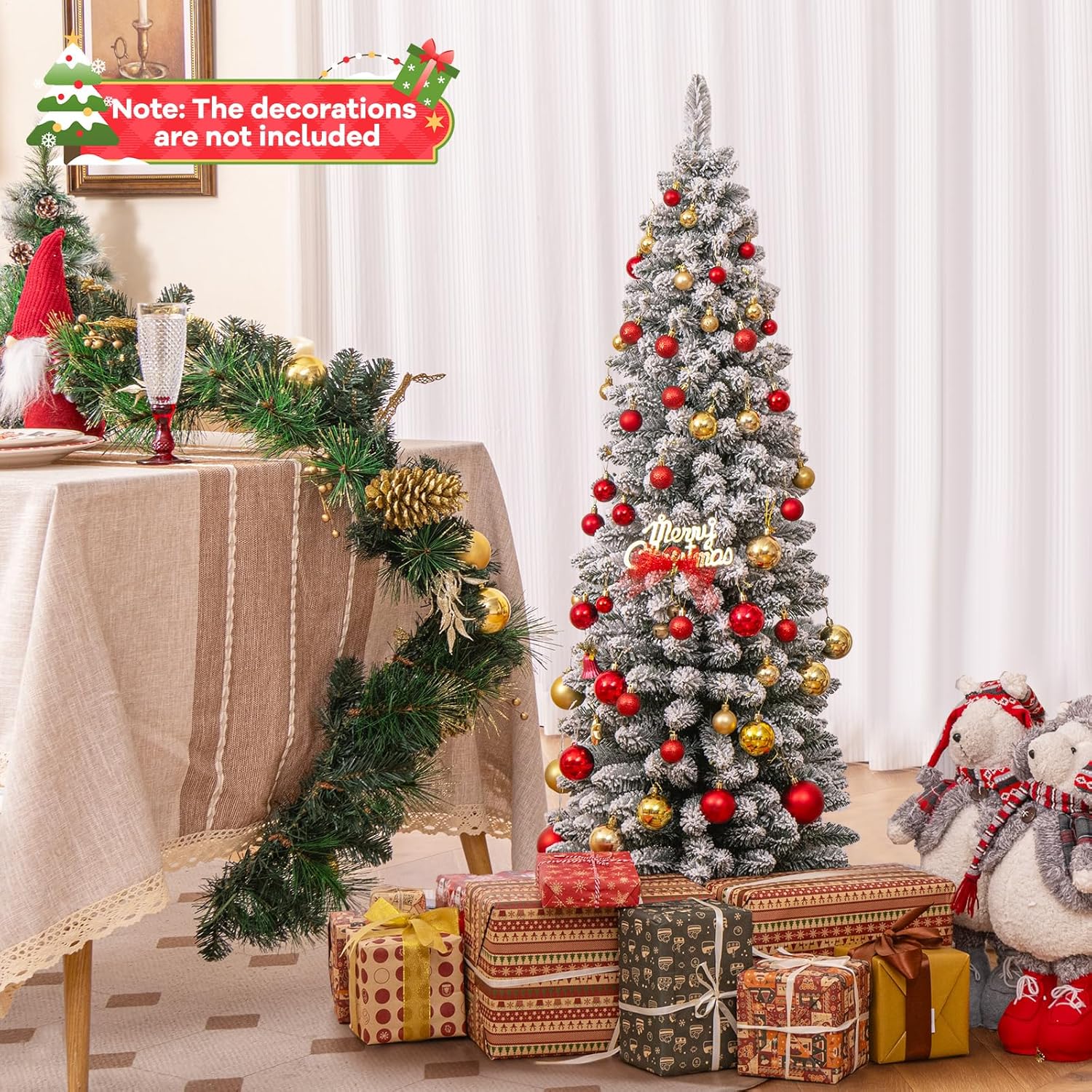 • Sapin de Noël Enneigé - Ce sapin de Noël a été conçu en forme de crayon, sa forme étroite et haute fait que l'arbre prend moins de place. Avec 240/328 branches denses, l'arbre a un aspect dense et riche, et son aspect réaliste donne l'impression d'être au milieu de la neige, ce qui est à la fois pratique et beau.