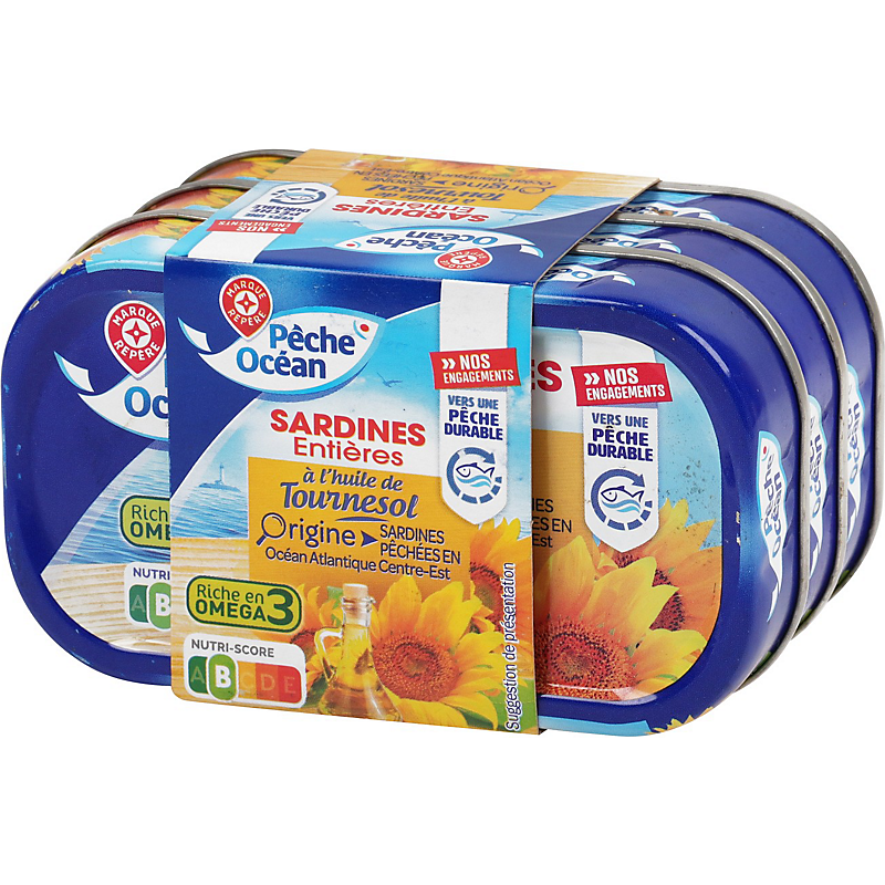 | Origine des principaux ingrédients | SARDINE PECHEE EN : OCEAN ATLANTIQUE CENTRE-EST, TOURNESOL ORIGINE : AFRIQUE, AMERIQUE ET/OU EUROPE*, SARDINE PECHEE EN : OCEAN ATLANTIQUE CENTRE-EST, TOURNESOL ORIGINE : AFRIQUE, AMERIQUE ET/OU EUROPE* * SELON LES APPROVISIONNEMENTS ET/OU LES CARACTÉRISTIQUES GUSTATIVES RECHERCHÉES |