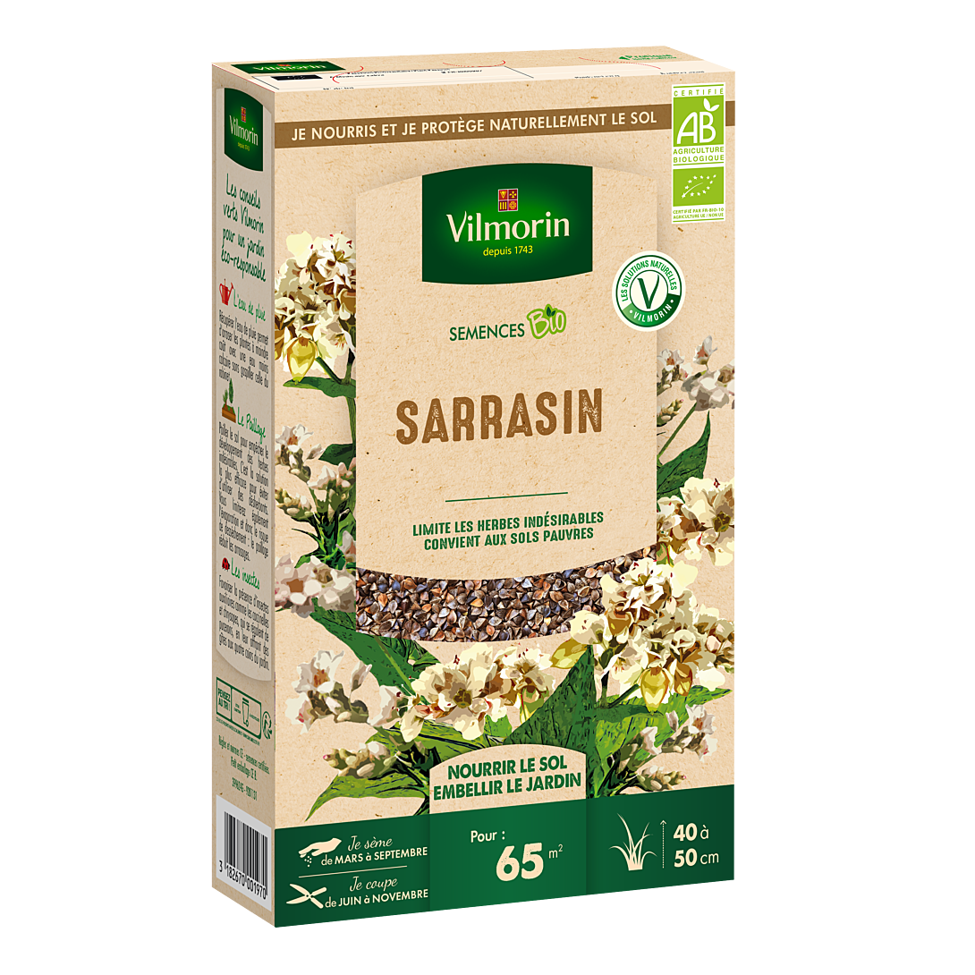 Le SARRASIN est une céréale que l'on peut semer au jardin comme engrais vert, notamment dans les sols pauvres et acides. C'est une plante au port érigé qui ne nécessite pas d'entretien spécifique. Un semis de sarrasin au printemps ou en été va prendre le dessus sur les mauvaises herbes et les empêcher de se développer, car il a une croissance très rapide.