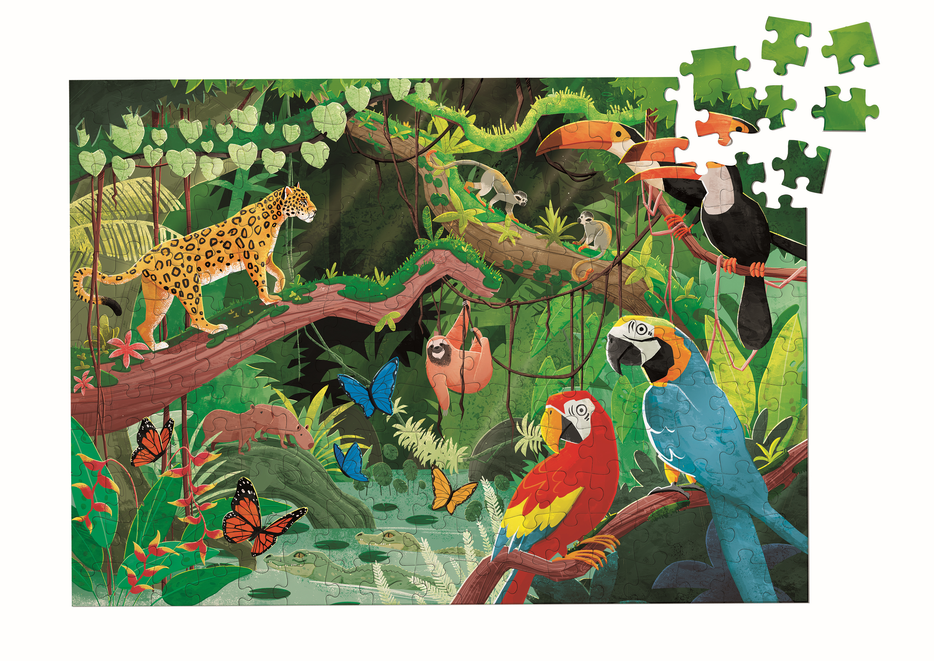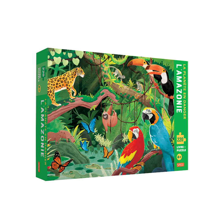 Notre planète regorge de merveilles : elle abrite un grand nombre d’habitats différents où vivent des espèces animales et végétales uniques en leur genre. Mais ces habitats sont en danger. L’Amazonie, qui en fait partie, est menacé par les incendies et la déforestation. Le « poumon de la Terre » risque de disparaître, entraînant l’extinction de sa faune et de sa flore et des conséquences irrémédiables pour l’homme. Comment peut-on, à notre échelle, éviter ce désastre ? Lis le livre pour le découvrir et apprendre un tas de choses sur l’Amazonie, puis fais le puzzle, très détaillé, qui l’accompagne !