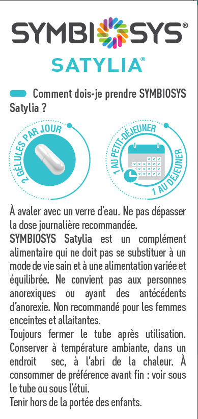 Prendre 2 gélules de SYMBIOSYS Satylia® par jour, 1 au petit déjeuner et 1 au déjeuner, avec un verre d’eau. Prendre SYMBIOSYS Satylia® quotidiennement. Ne pas dépasser la dose journalière recommandée.